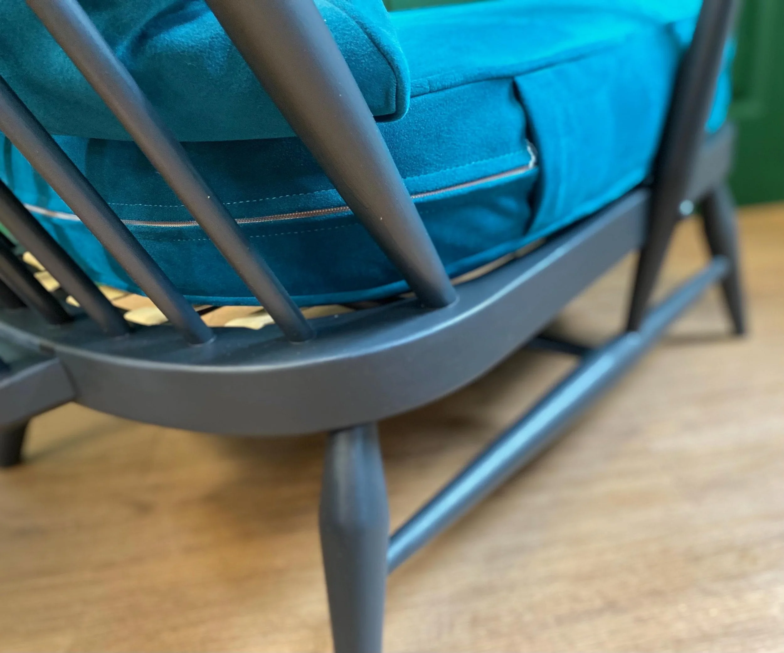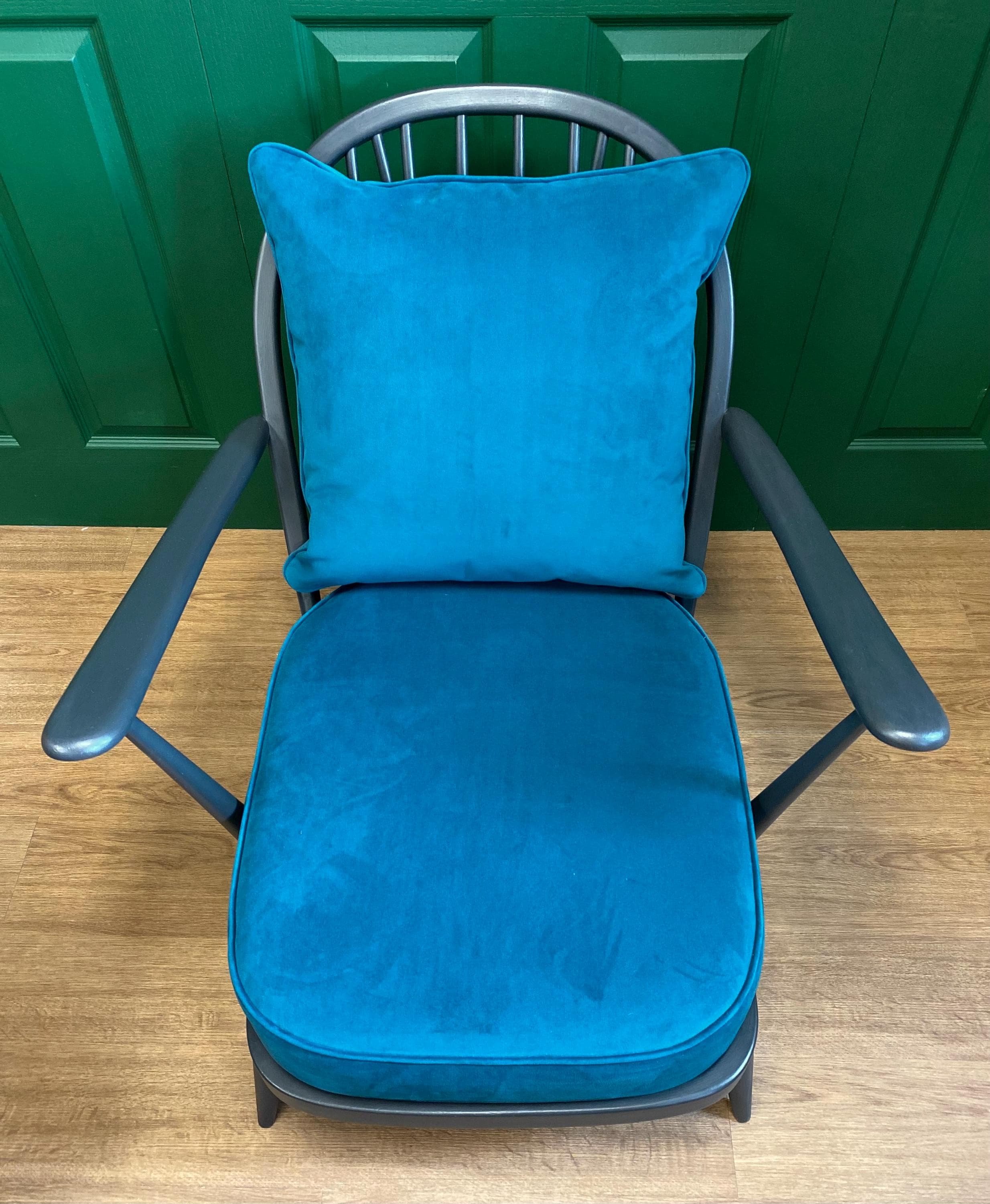 Mid century Ercol Windsor armchair Timeless elegant design Has been refurbished and reupholstered in a modern style The frame has been hand painted in a dark ash grey The foam and base straps have been replaced and it has been upholstered in a rich teal blue green velvet fabric. The original back cushions have been replaced with a scatter cushion for a more up to date look.