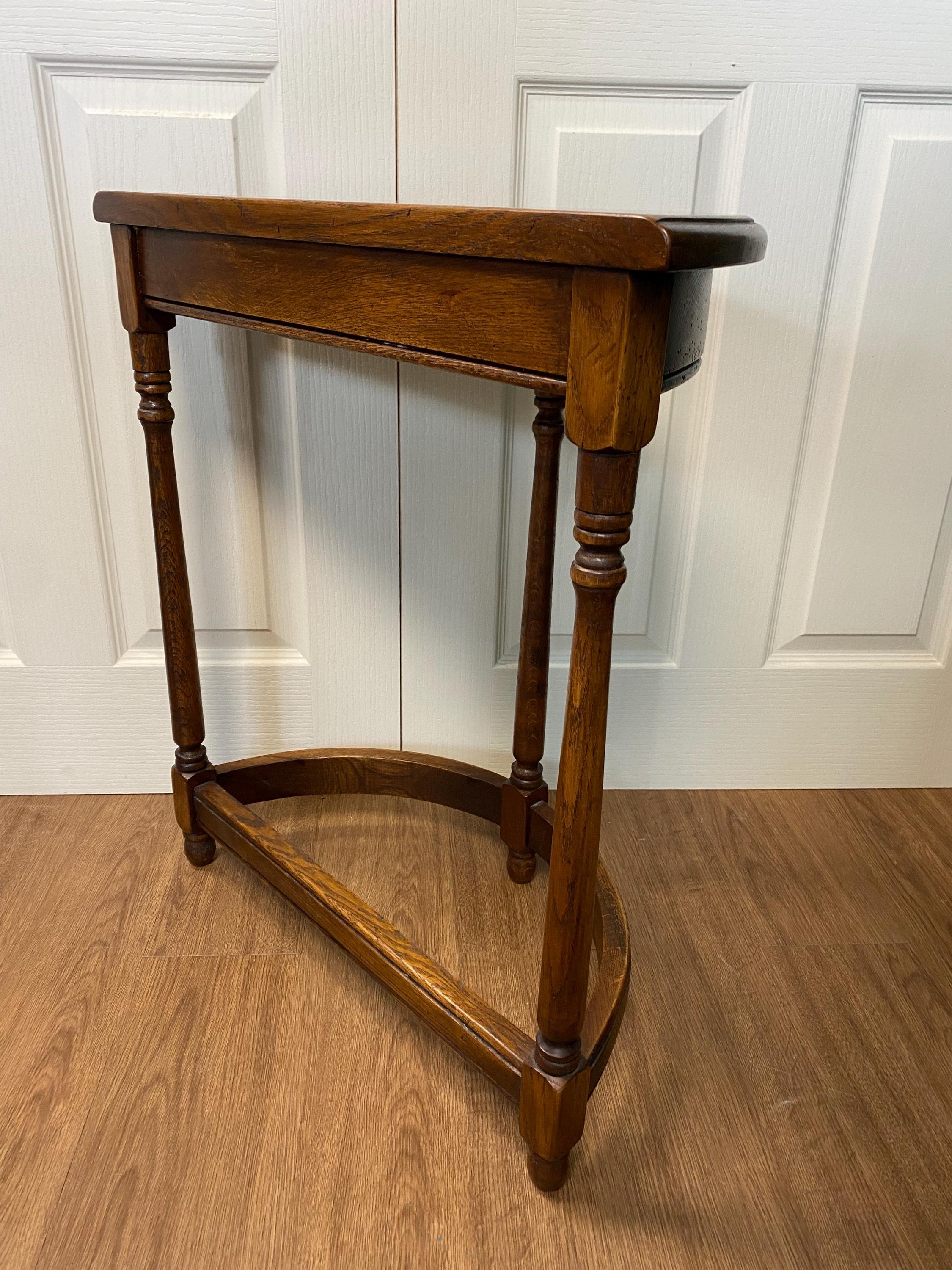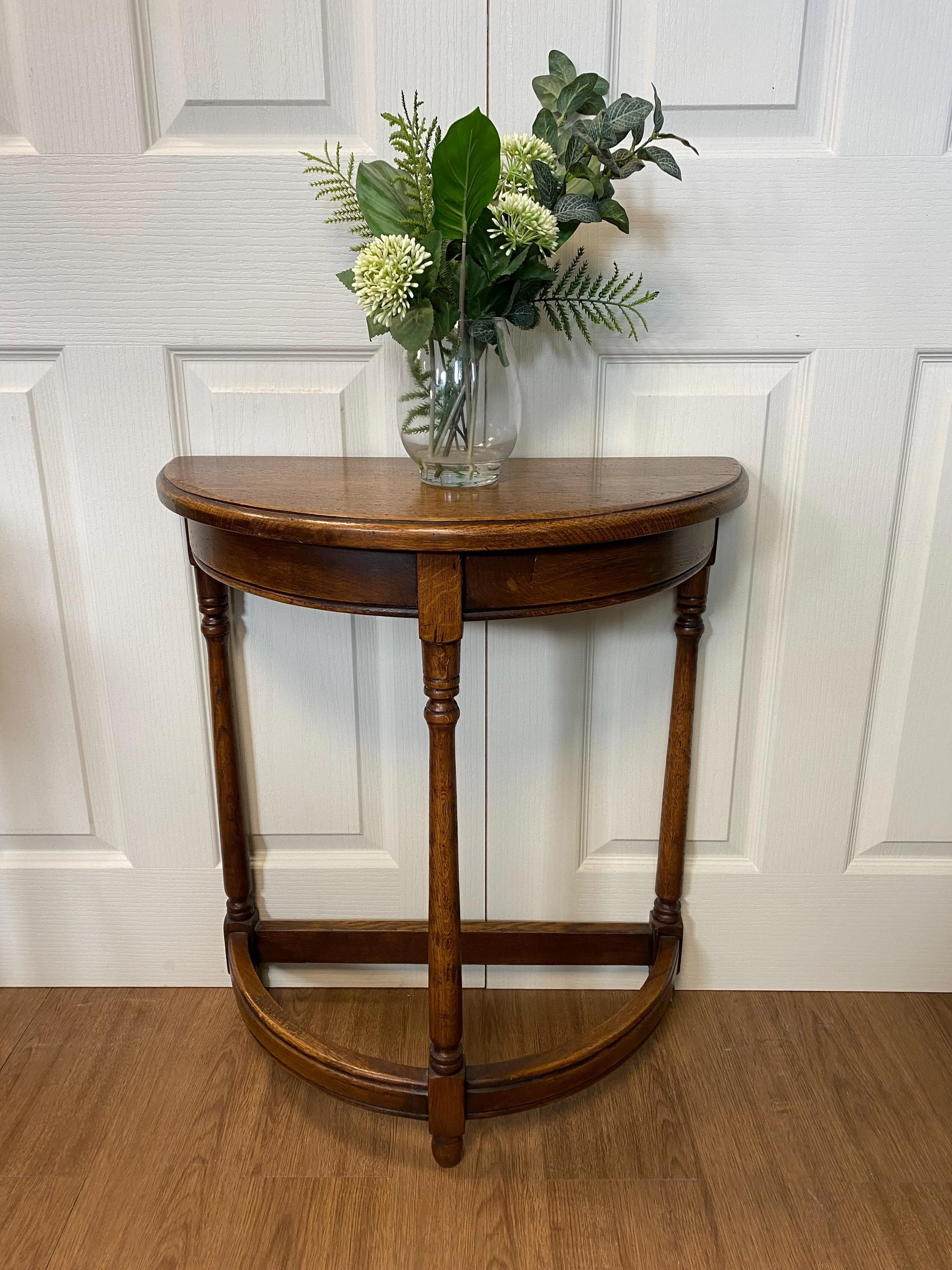 Reproduction solid oak half moon hall console table Elegant curved design with three turned legs with spacer at the base The wood is in beautiful condition with an attractive patina