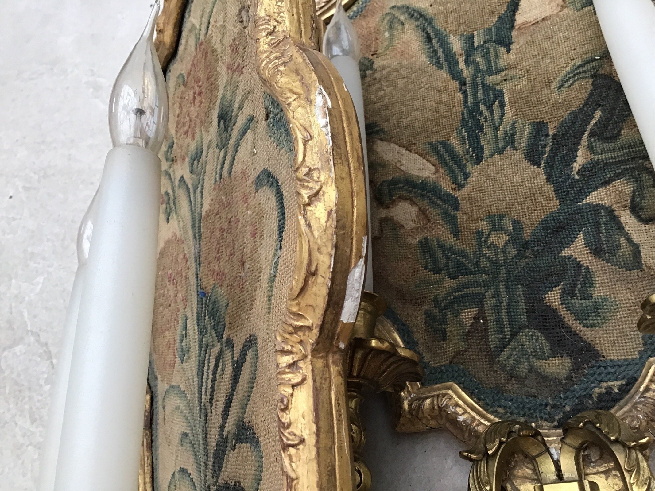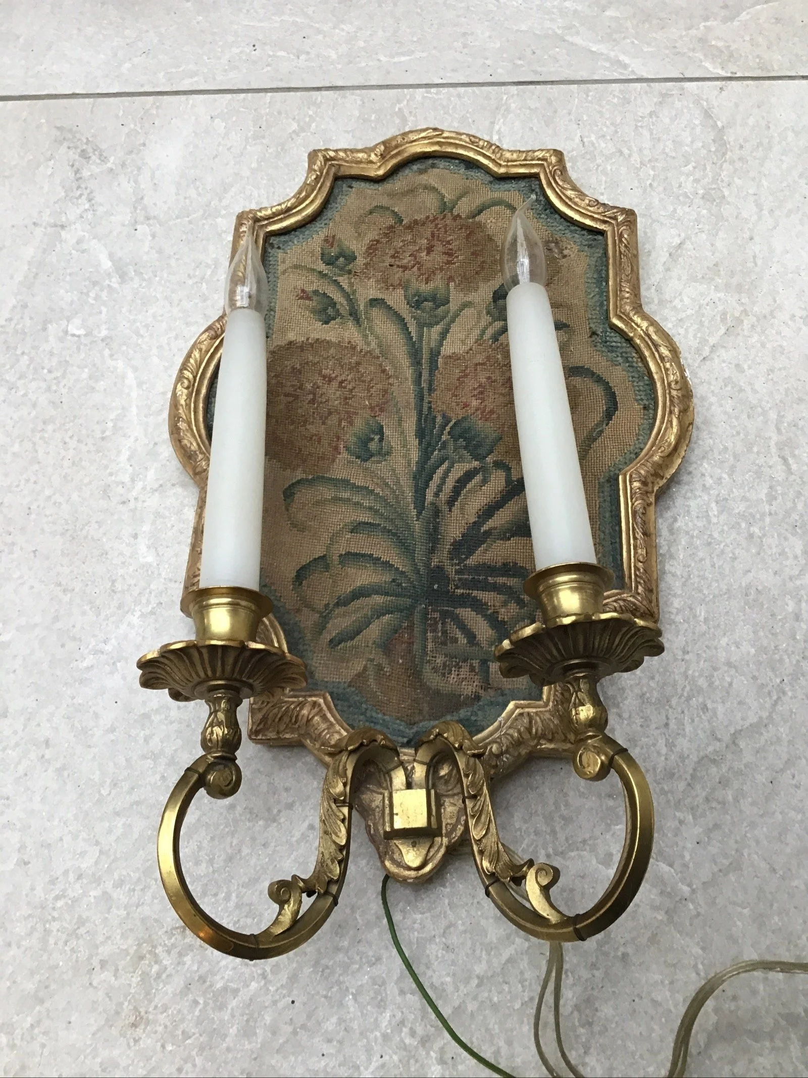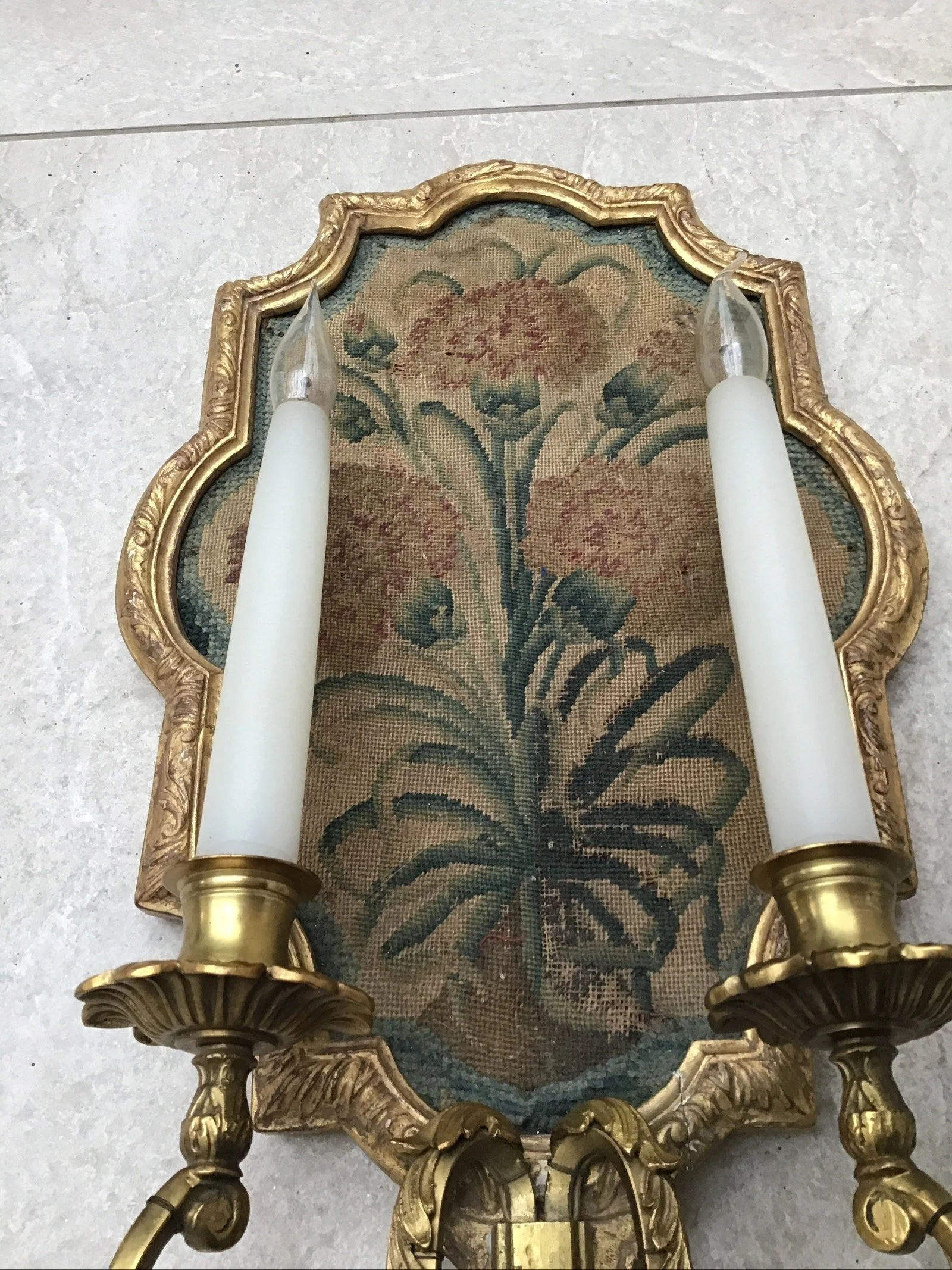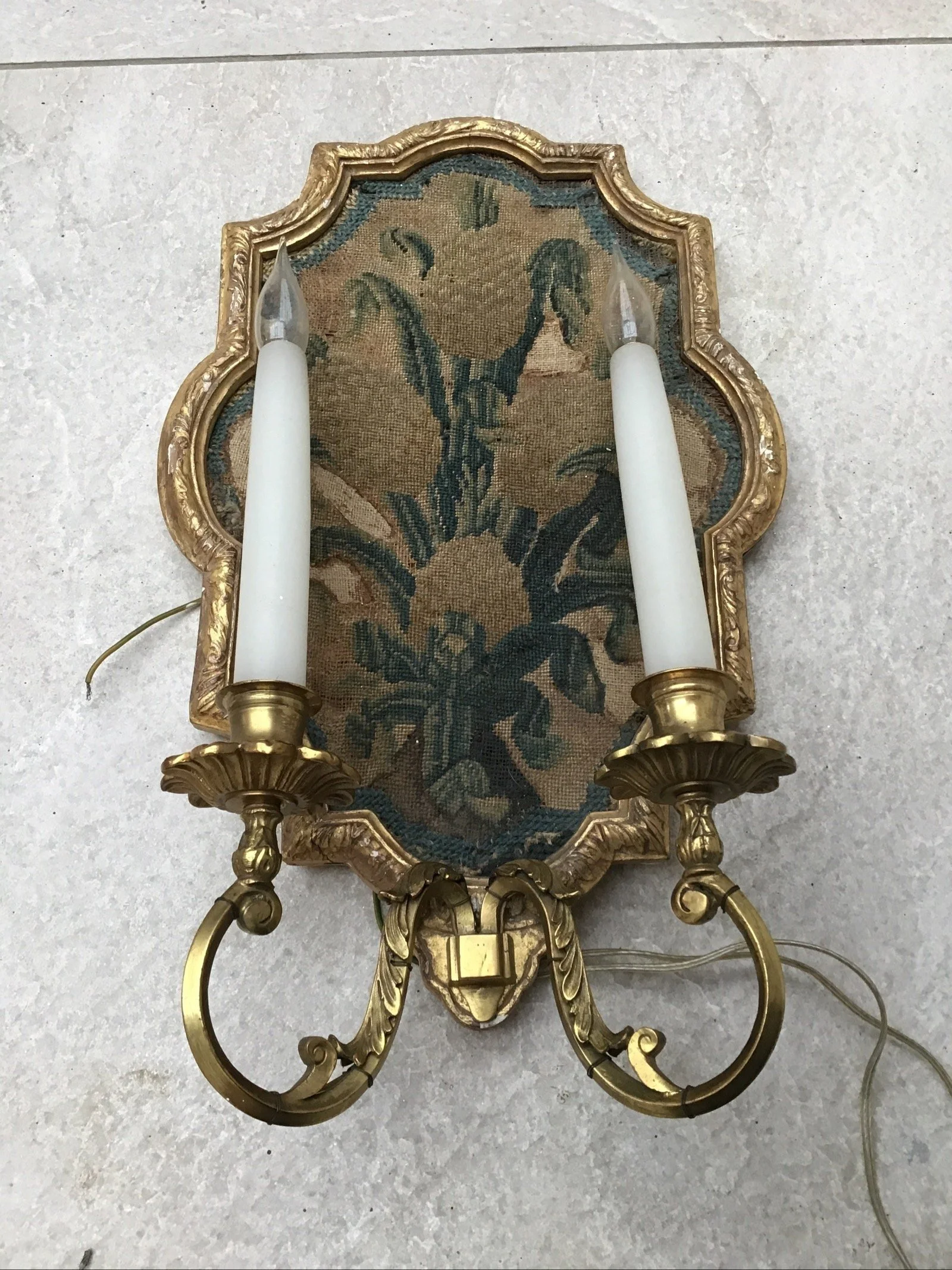Three antique French Louis XVI style tapestry wall lights sconces, tapestry