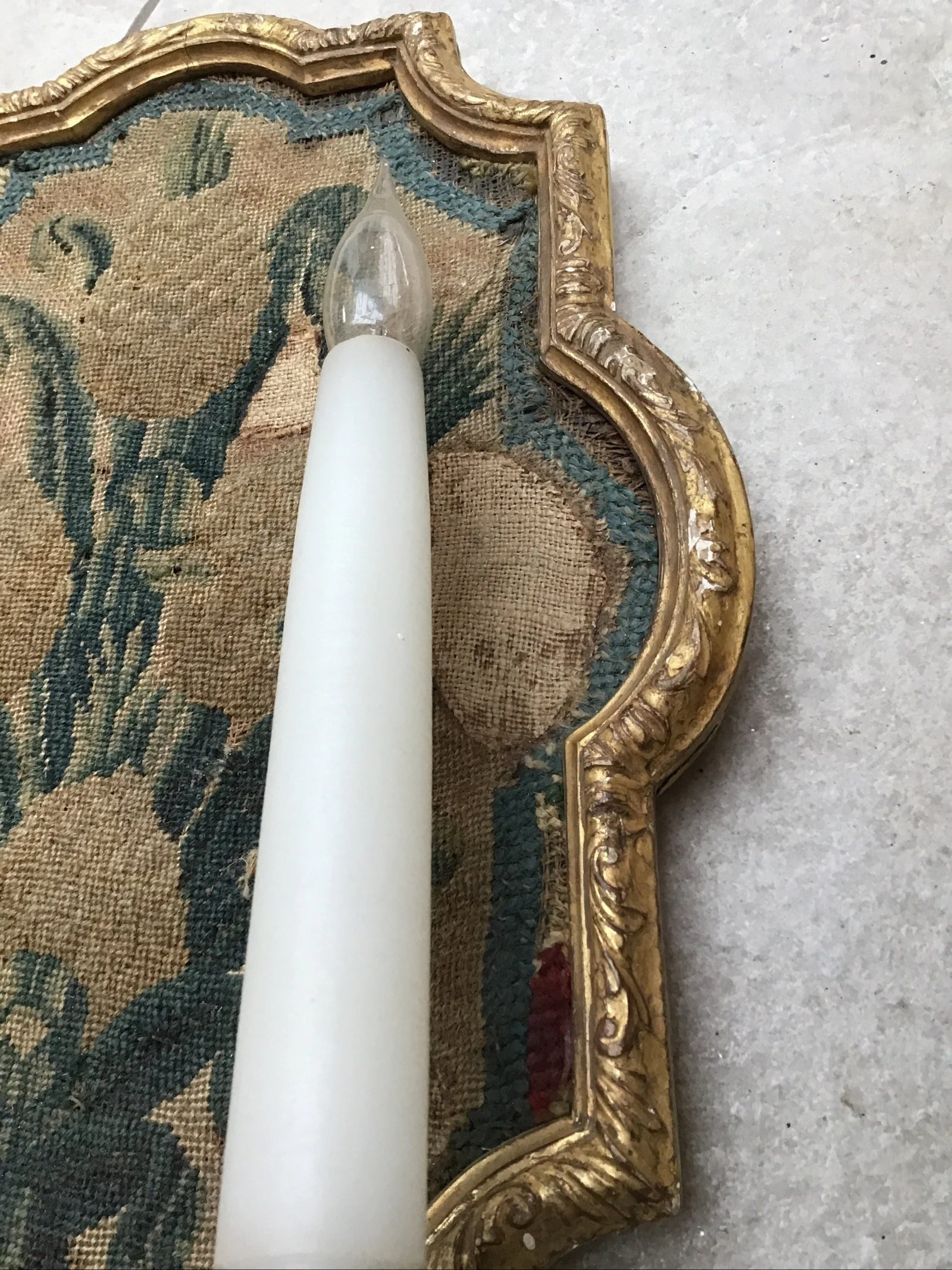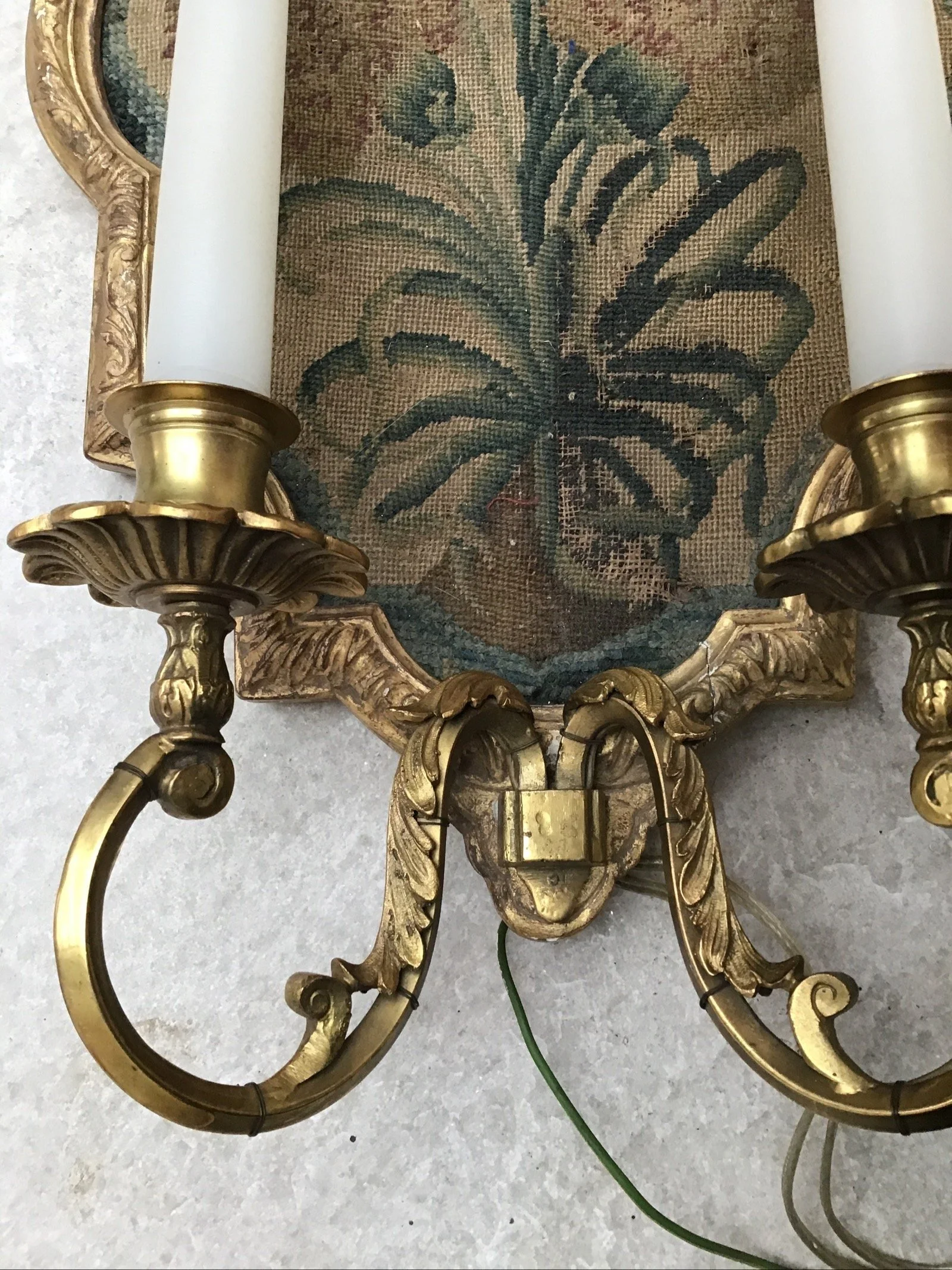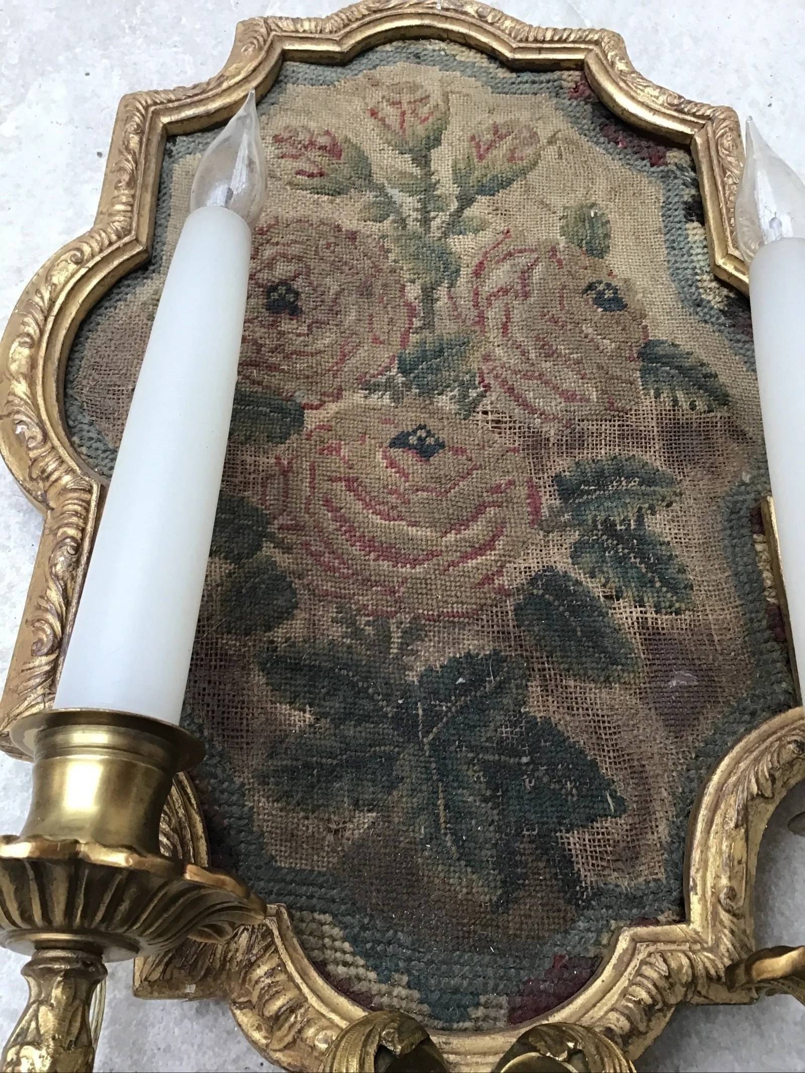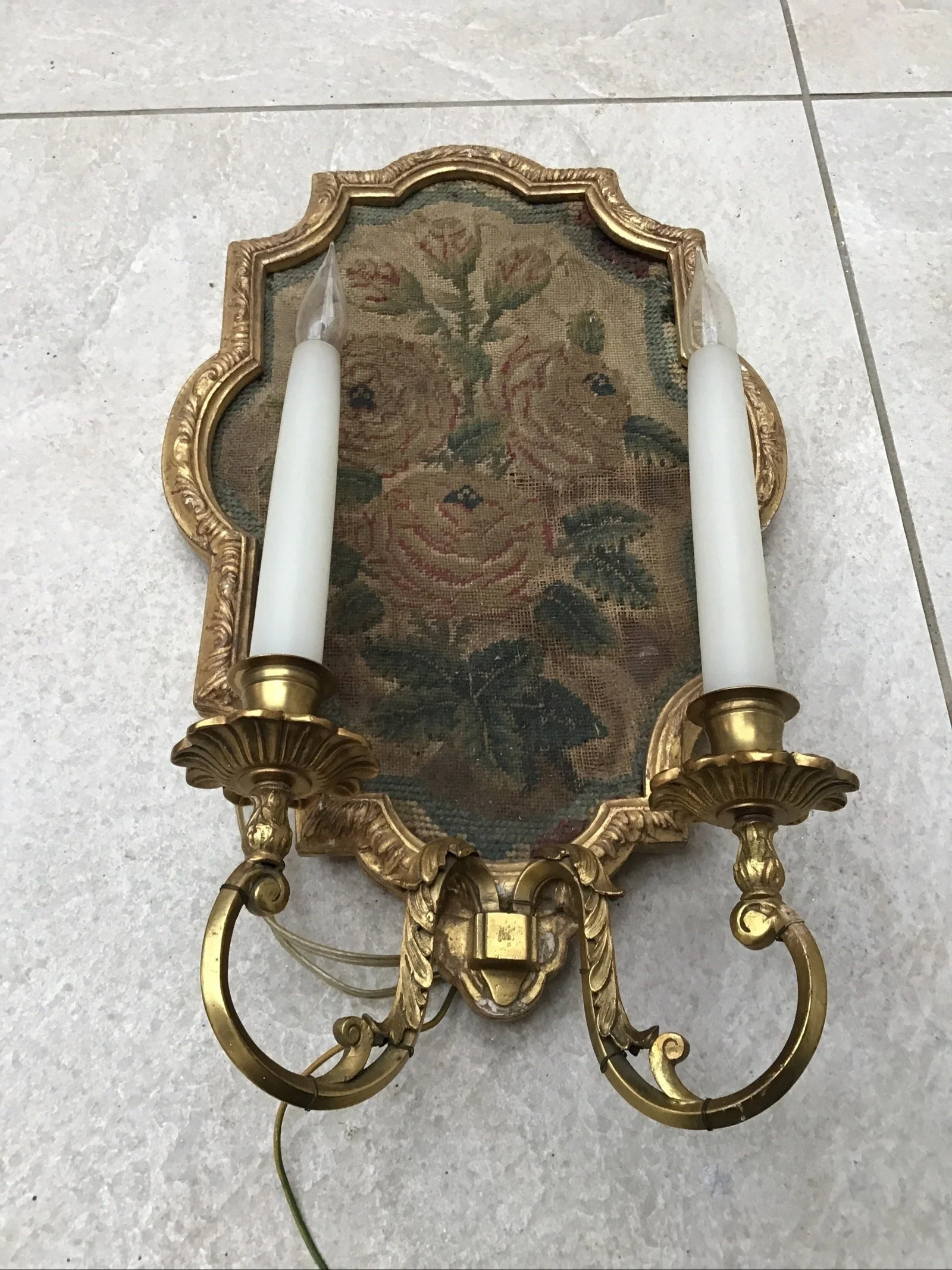 Three antique French Louis XVI style tapestry wall lights sconces, tapestry