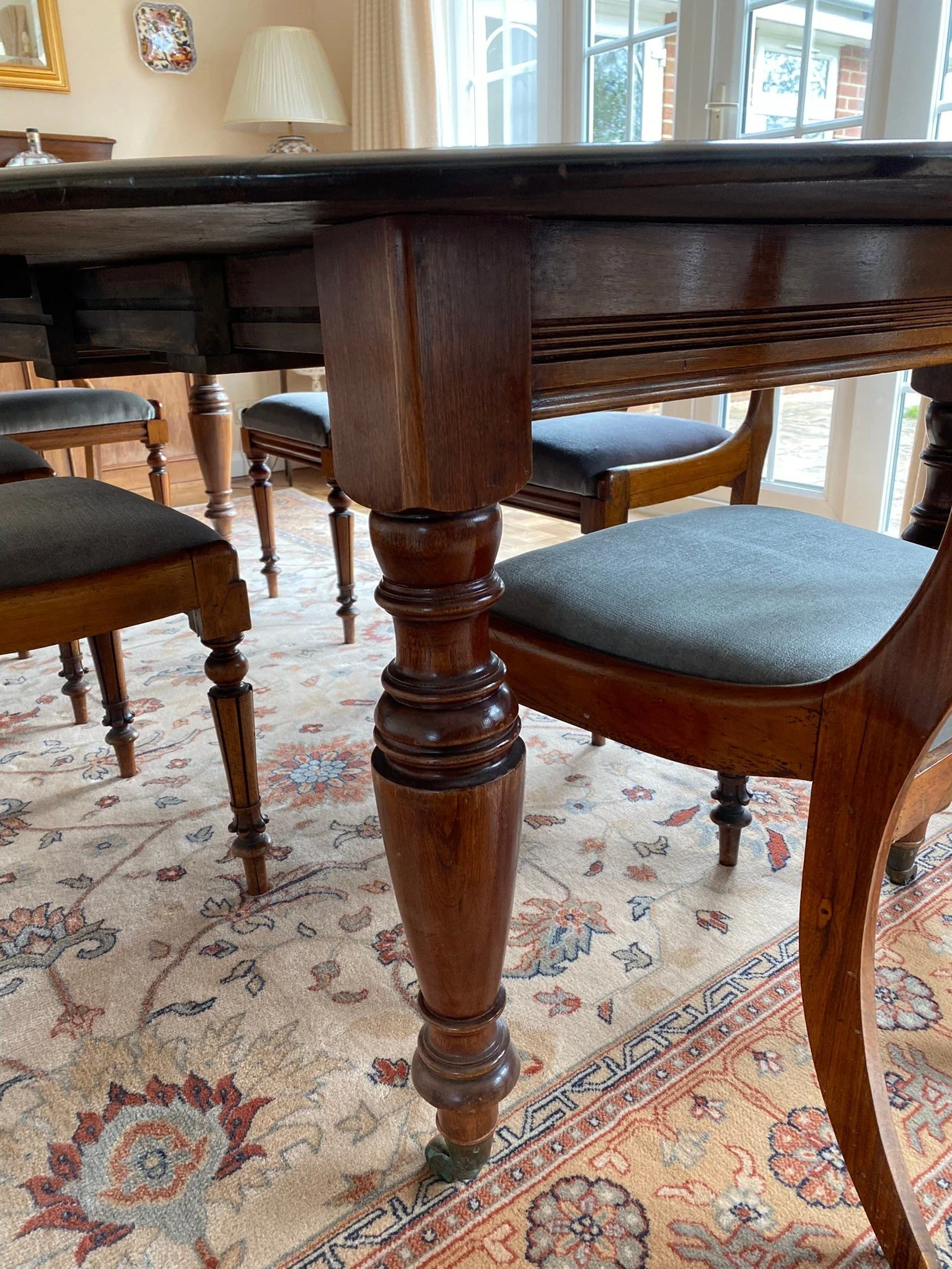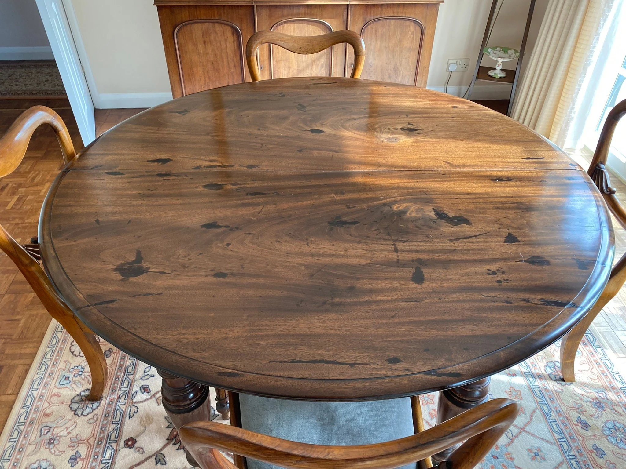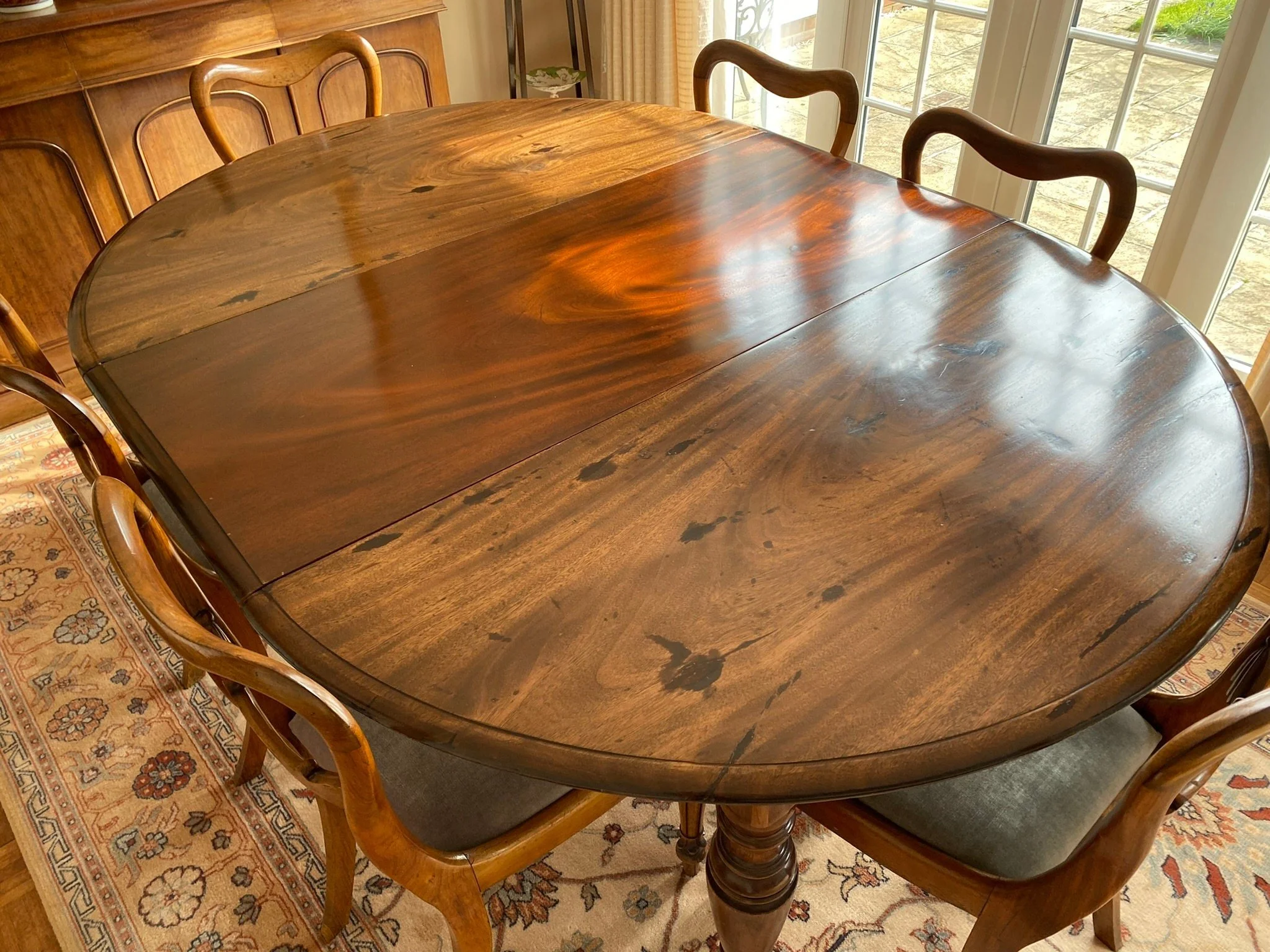 A beautiful high quality antique piece in very good condition. The two extension leaves are darker as they haven’t been used much, see photos. There is the odd light surface scuff which can be oiled out, see photos. Some of the seat cushions are a bit sun faded sun faded at the back, see photos.