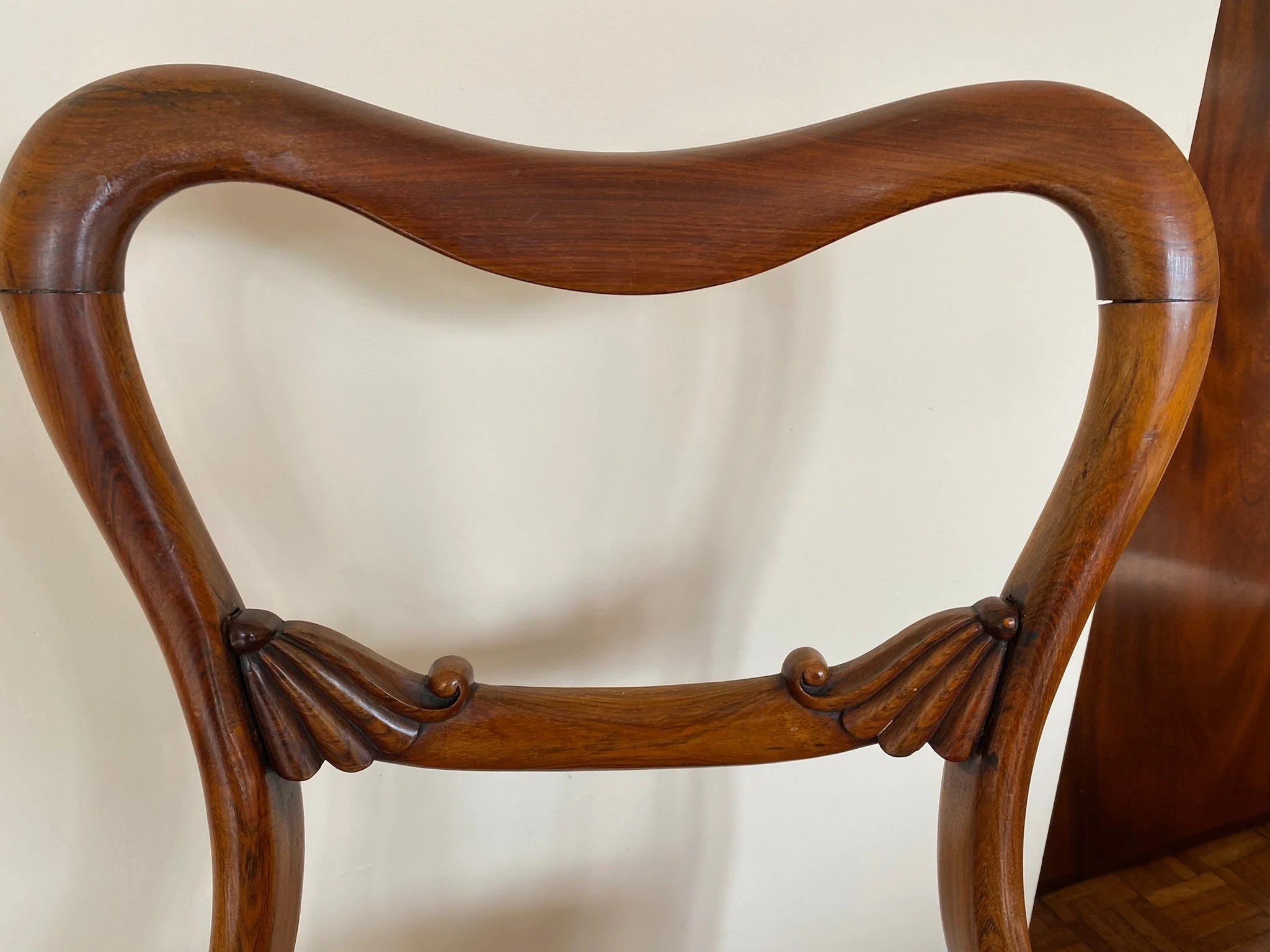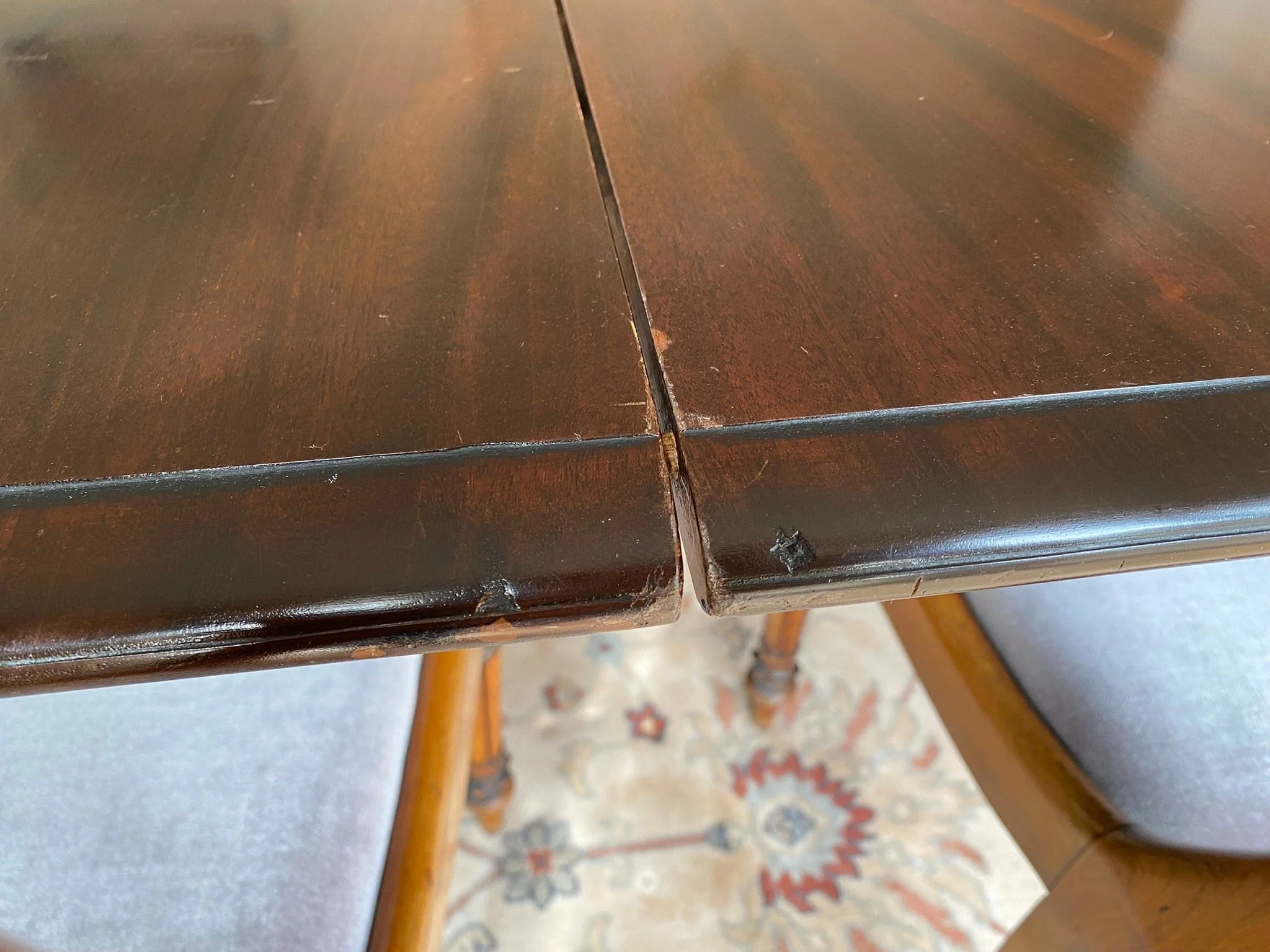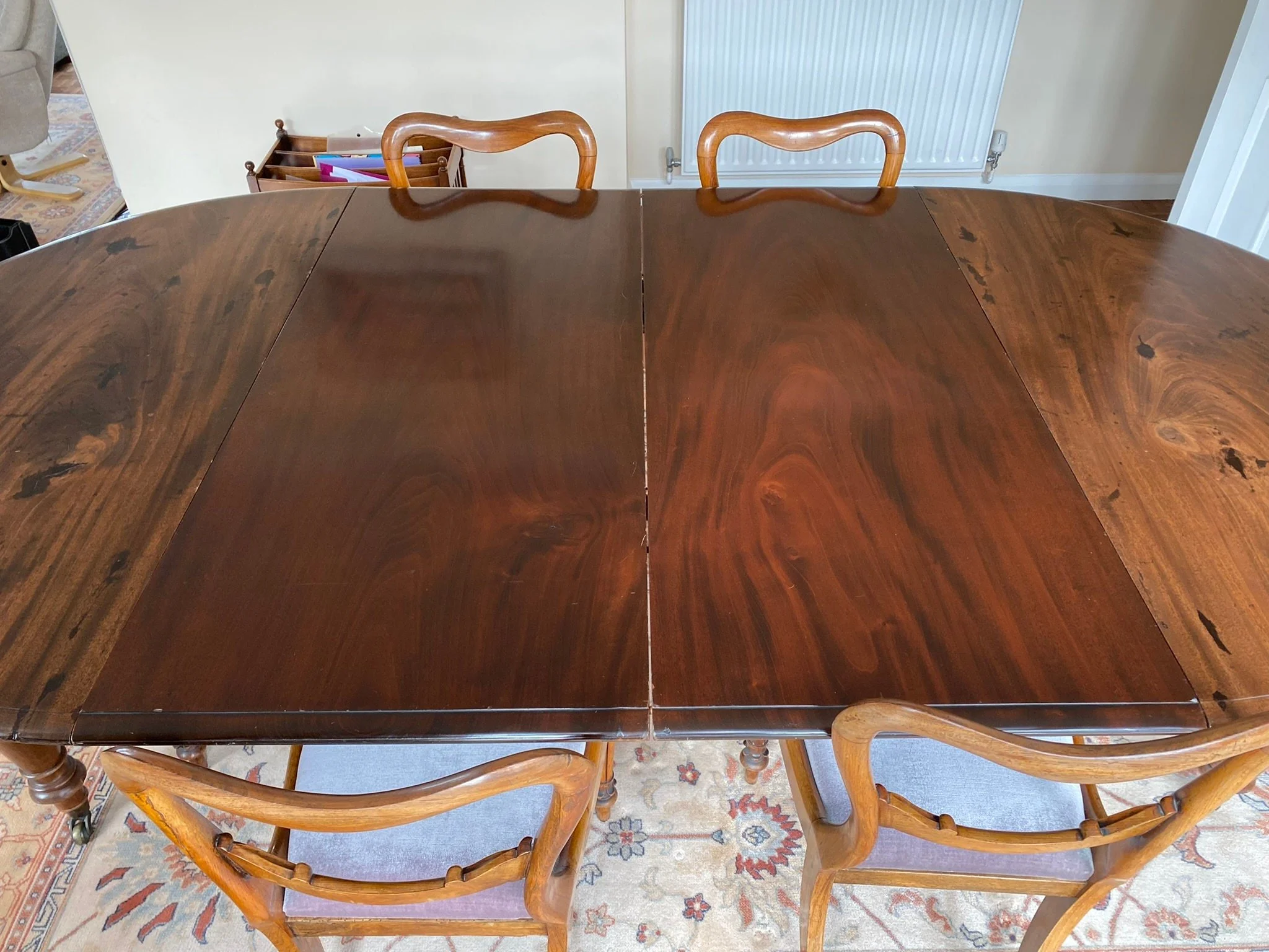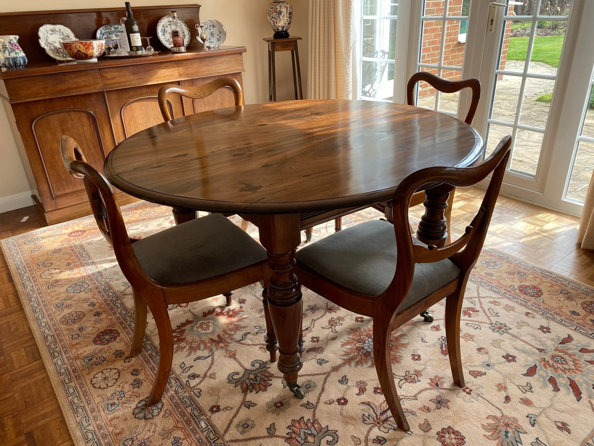 A beautiful high quality antique piece in very good condition. The two extension leaves are darker as they haven’t been used much, see photos. There is the odd light surface scuff which can be oiled out, see photos. Some of the seat cushions are a bit sun faded sun faded at the back, see photos.