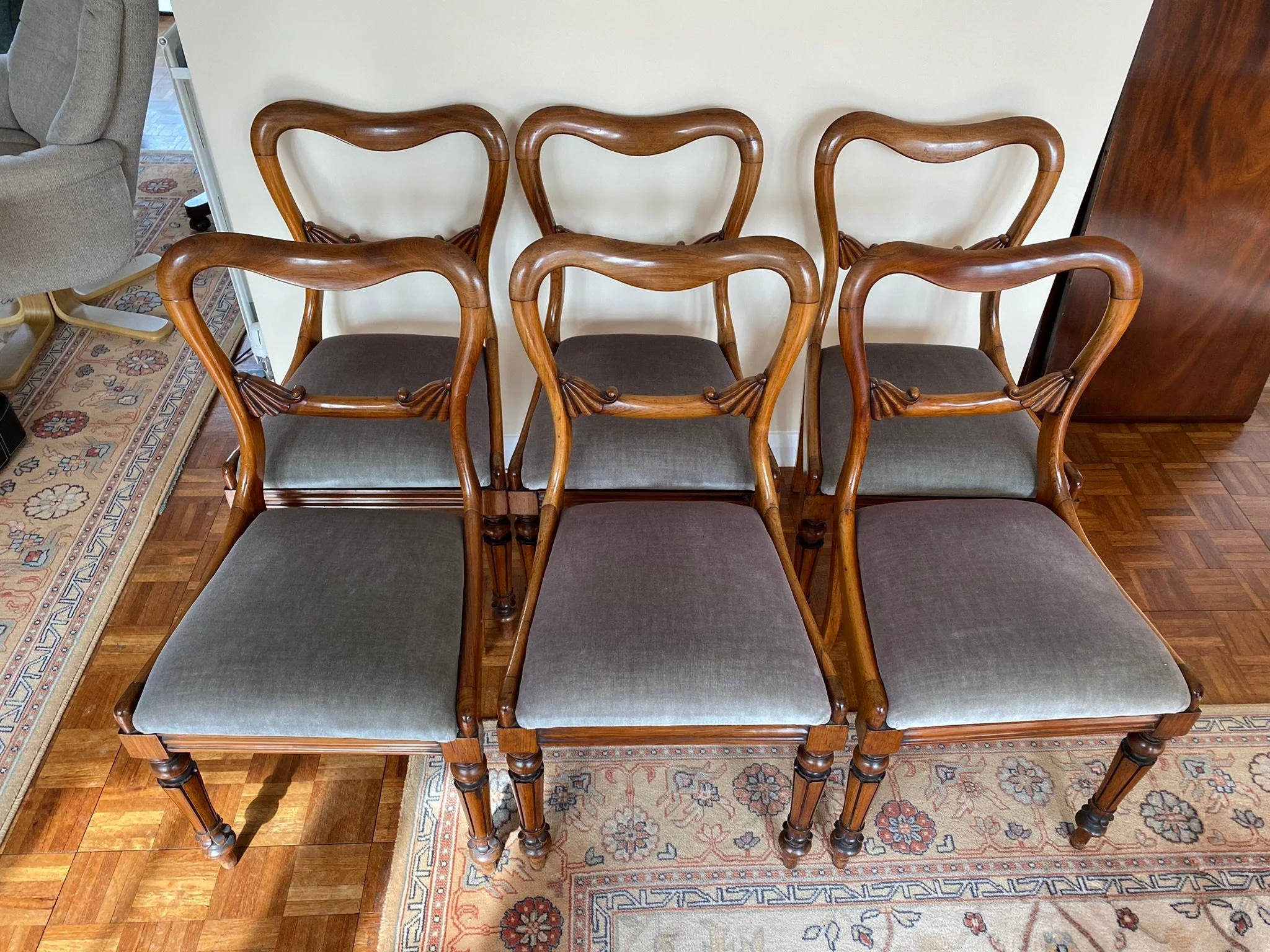 Comes with six Victorian rosewood chairs Balloon back with carved front legs Upholstered in grey/blue velvet