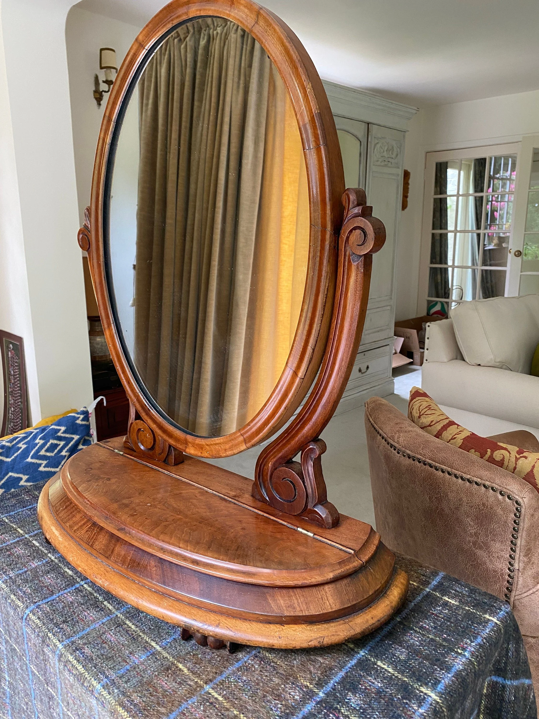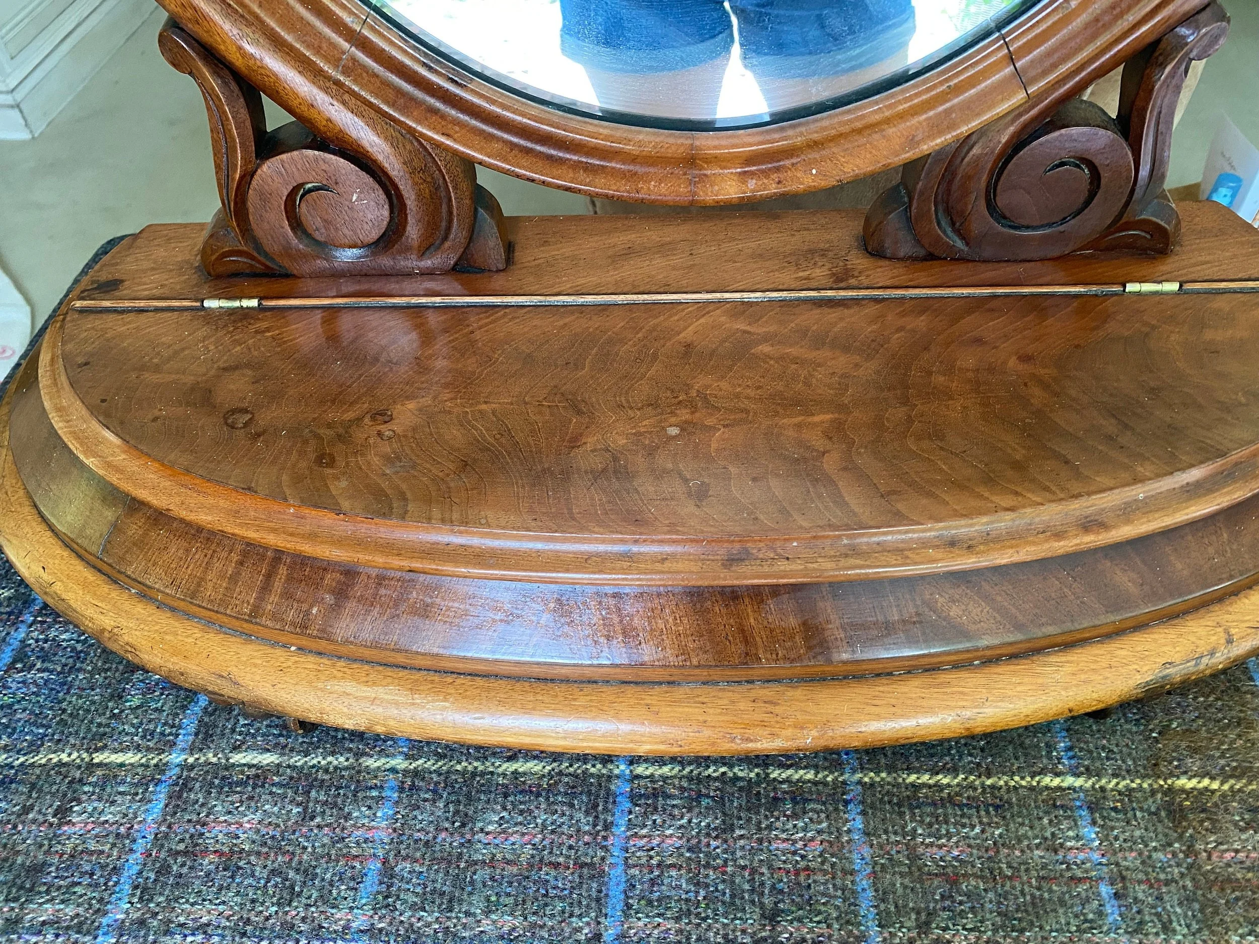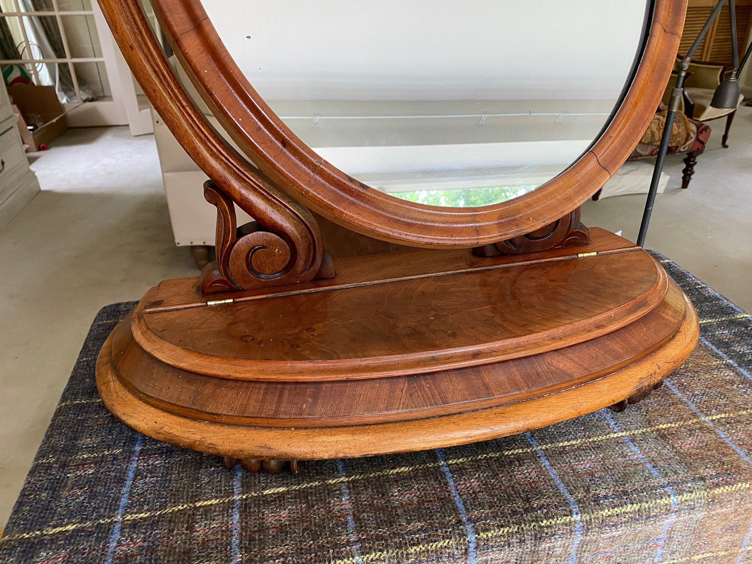 Antique Victorian tilting mahogany dressing table mirror Oval shaped mahogany framed with swing mirror supported by carved scrolled supports On a mahogany moulded edge base with a storage compartment with lift up lid Carved feet