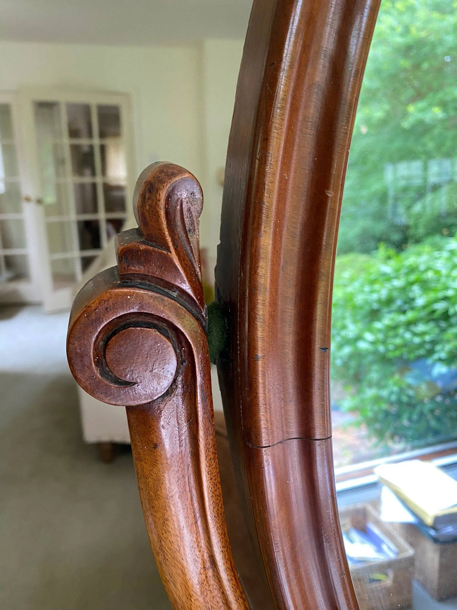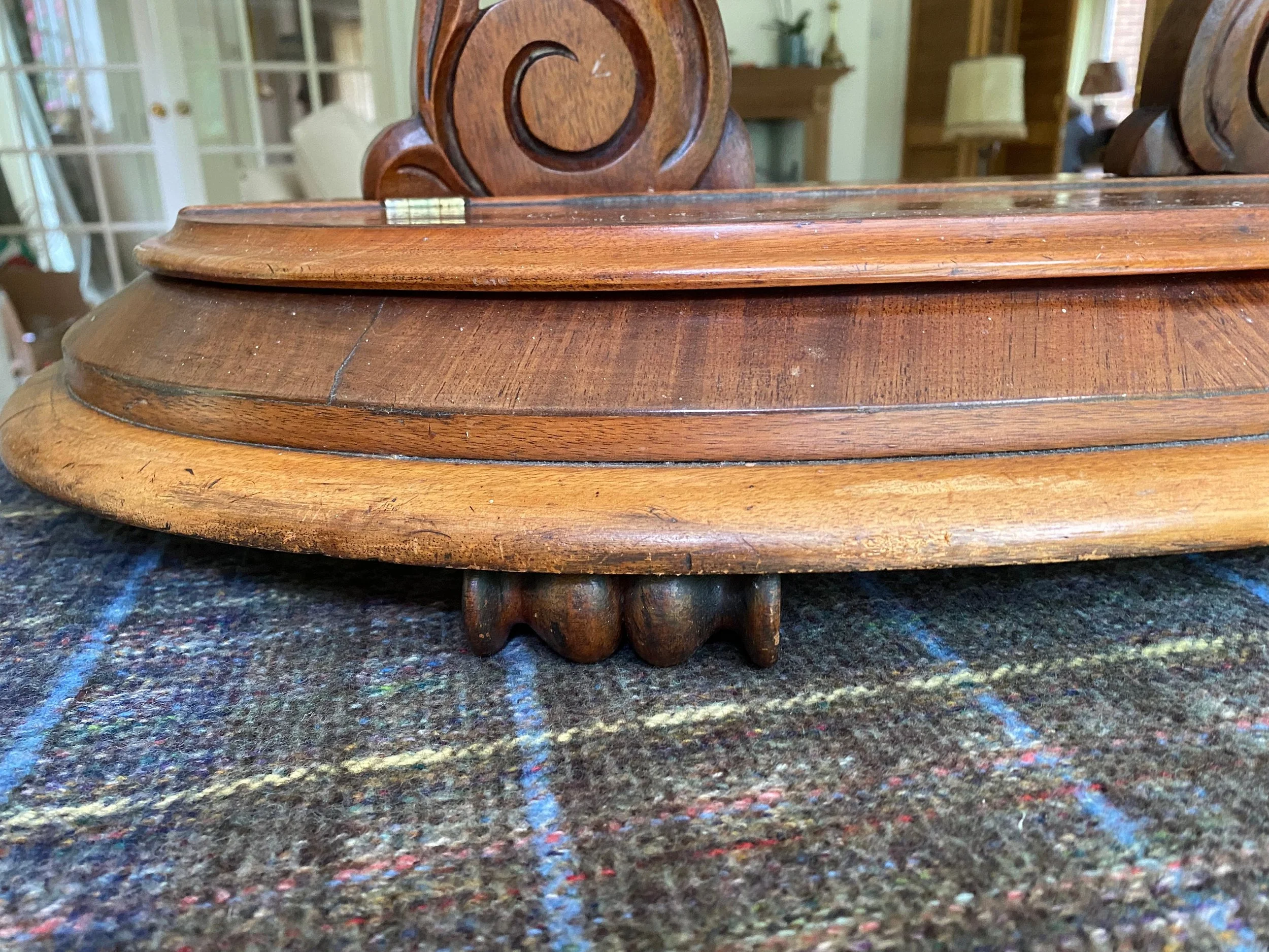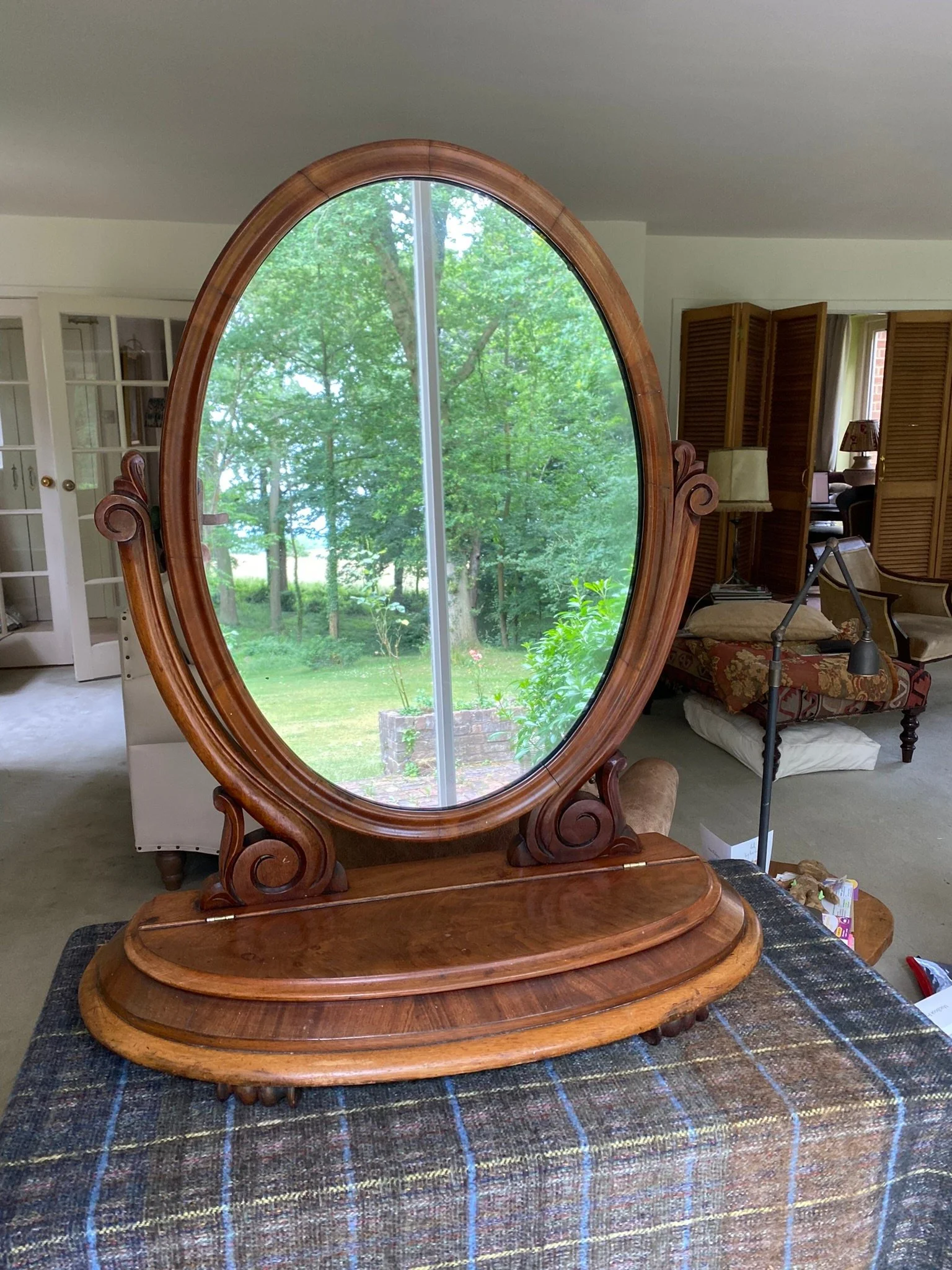 Antique Victorian tilting mahogany dressing table mirror Oval shaped mahogany framed with swing mirror supported by carved scrolled supports On a mahogany moulded edge base with a storage compartment with lift up lid Carved feet