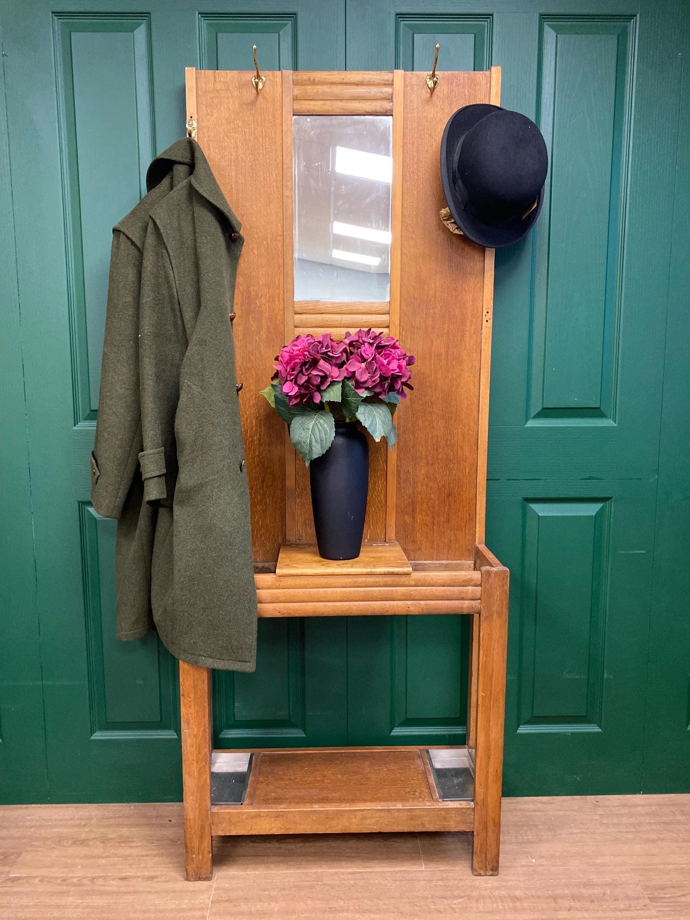 Vintage 1930s Oak Mirrored Hall Stand Coat Rack Umbrella Stand