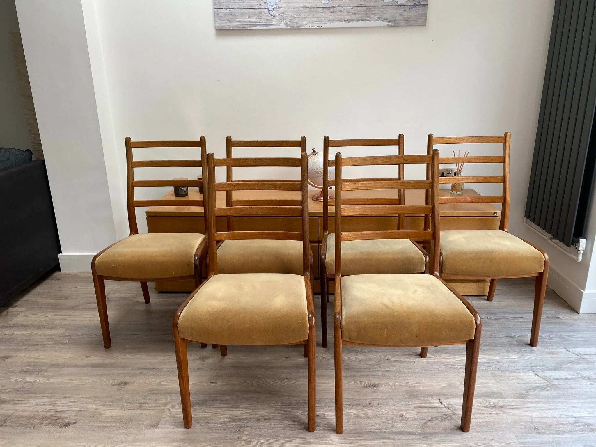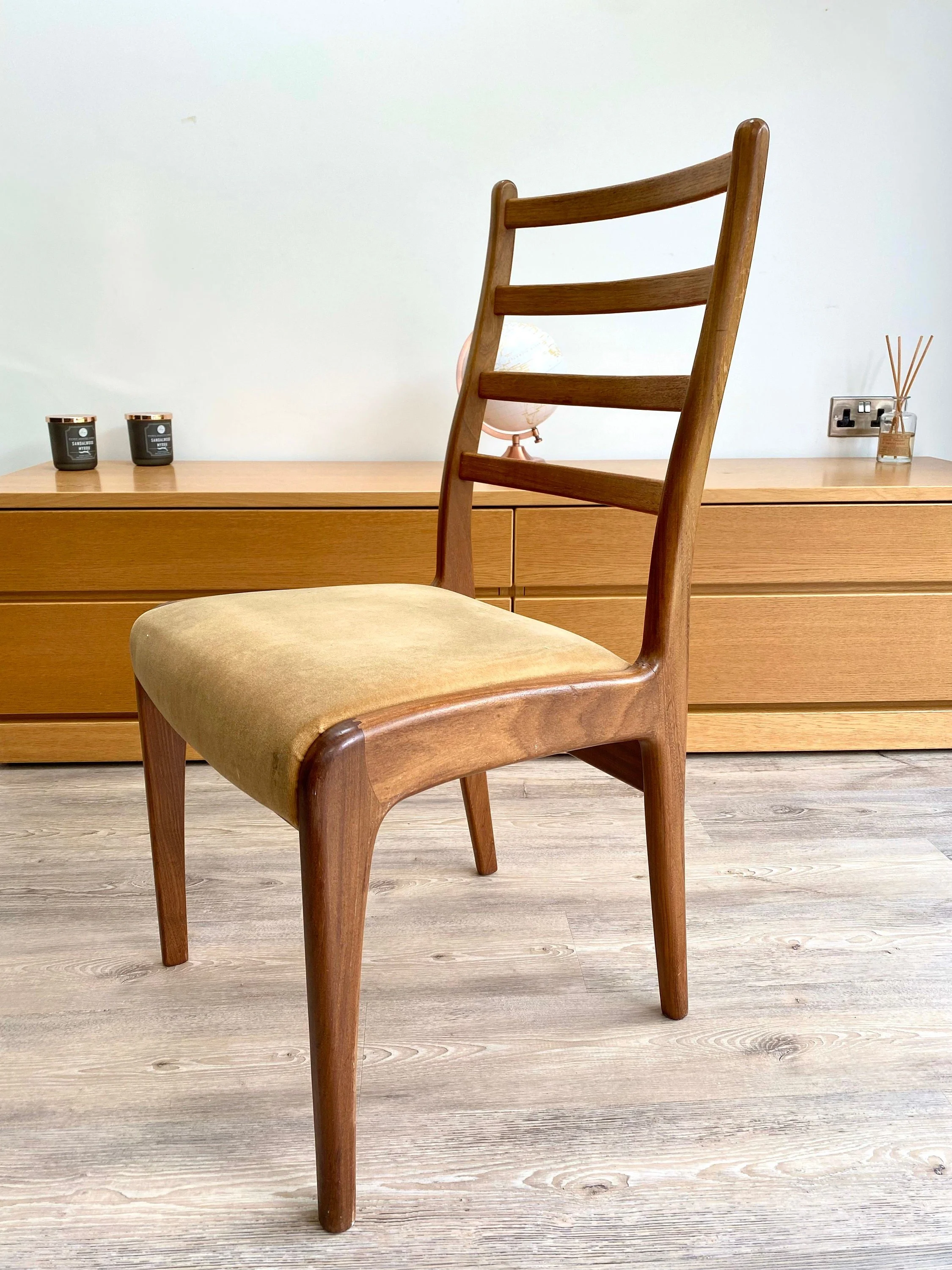 Ladder back chairs with gold velour seats. Gently curved back and legs