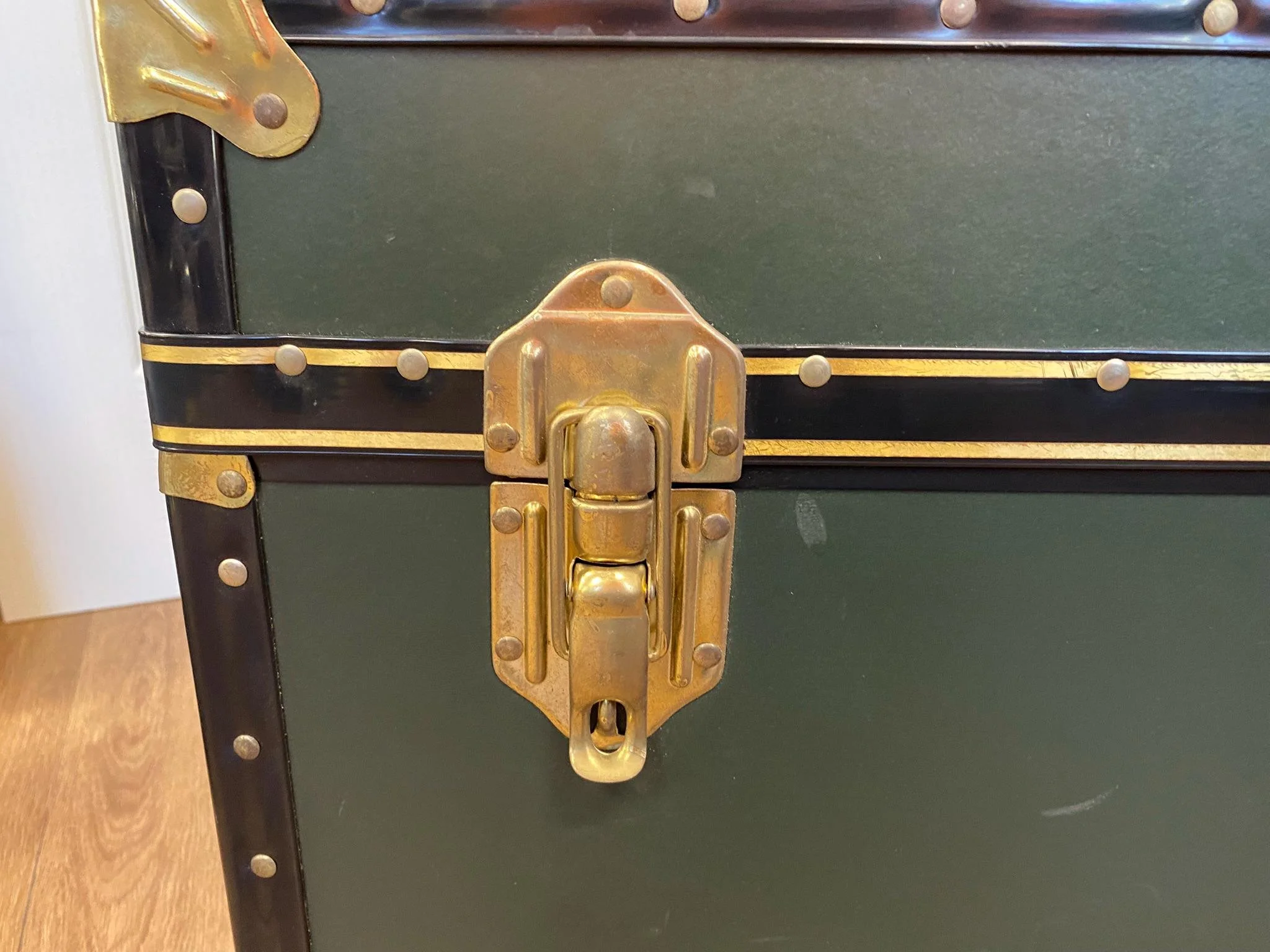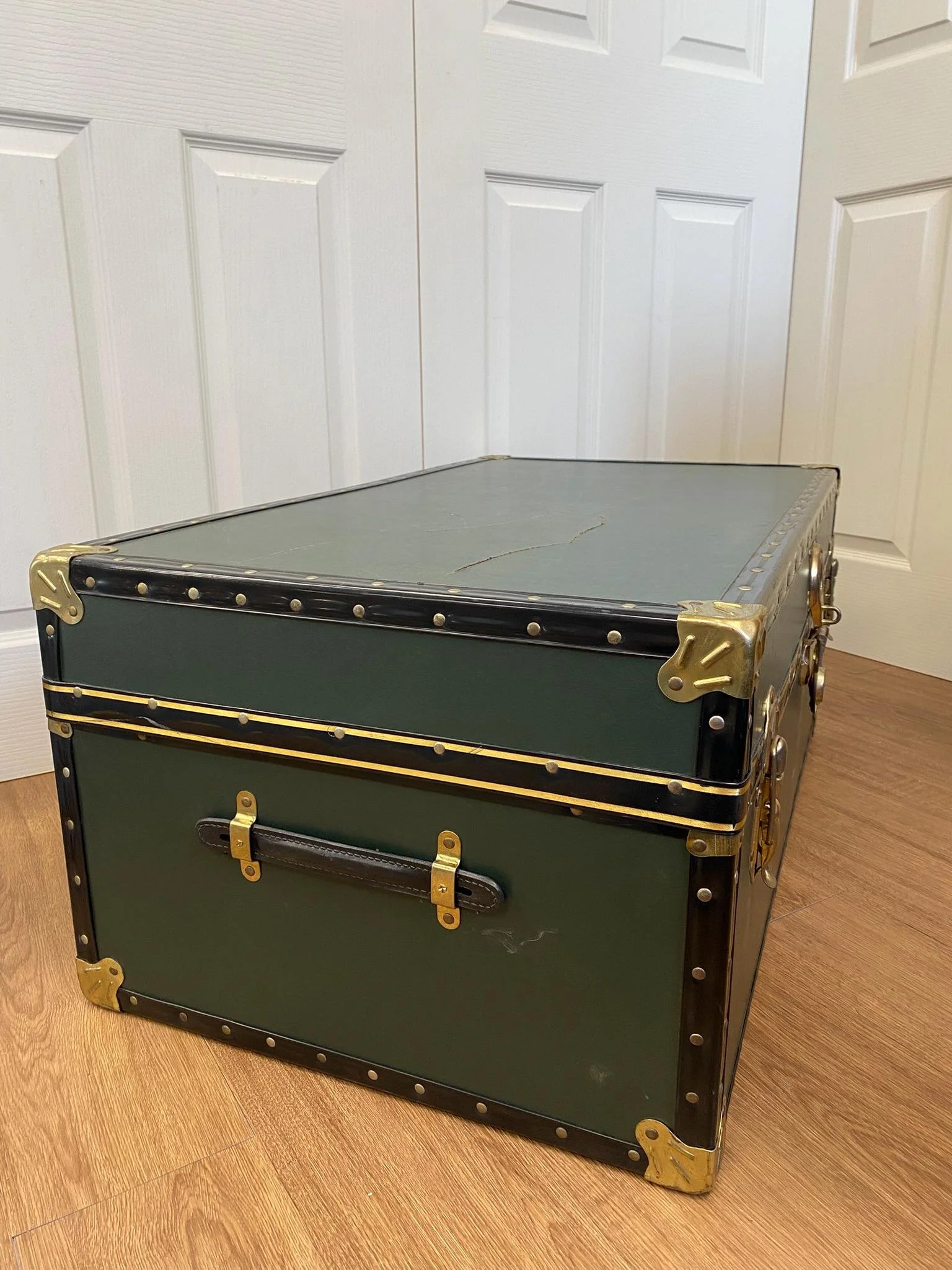Vintage green and brass steamer trunk storage chest Circa 1970s Deep green with black edging and brass hardware Black leather side straps
