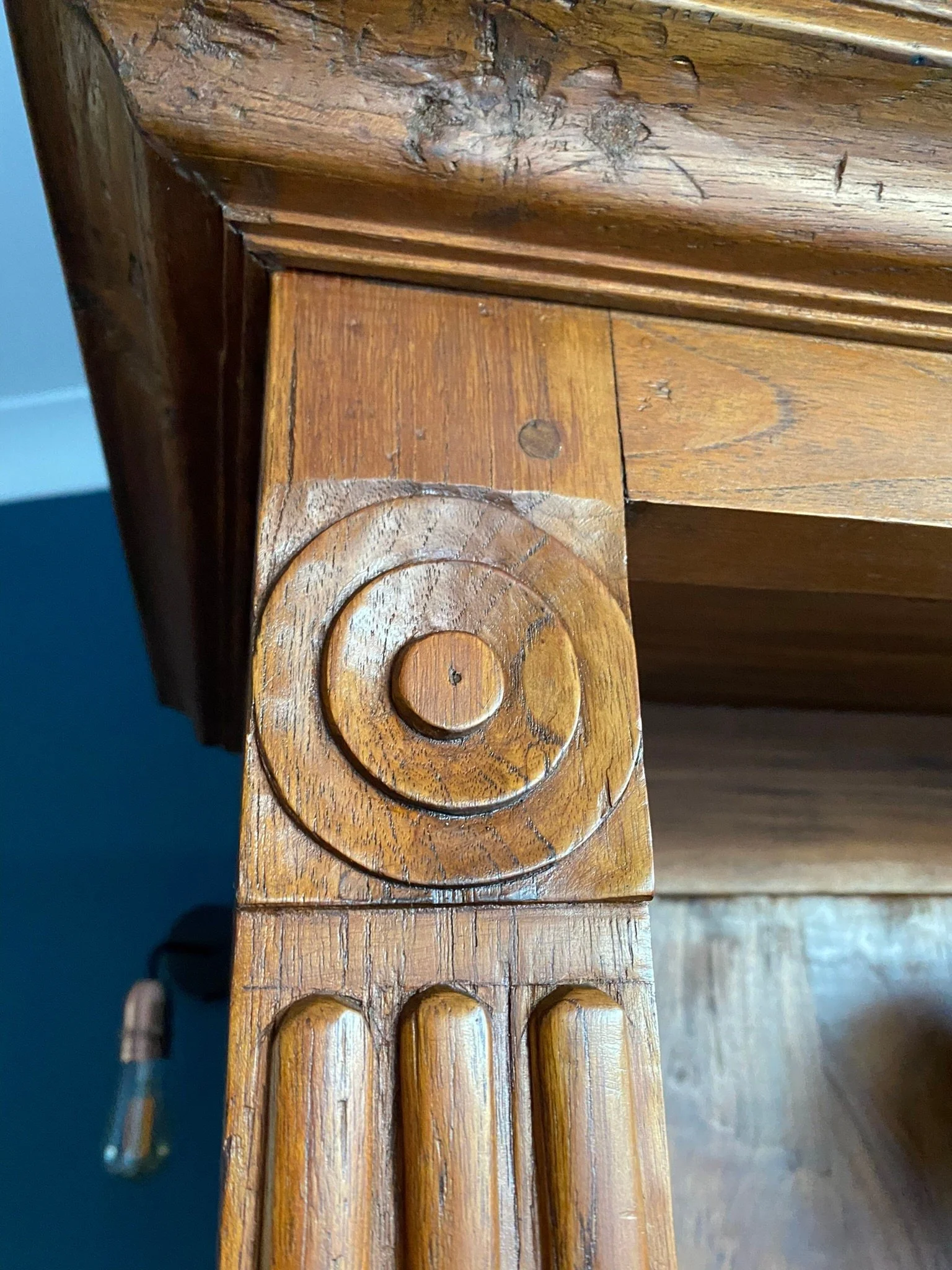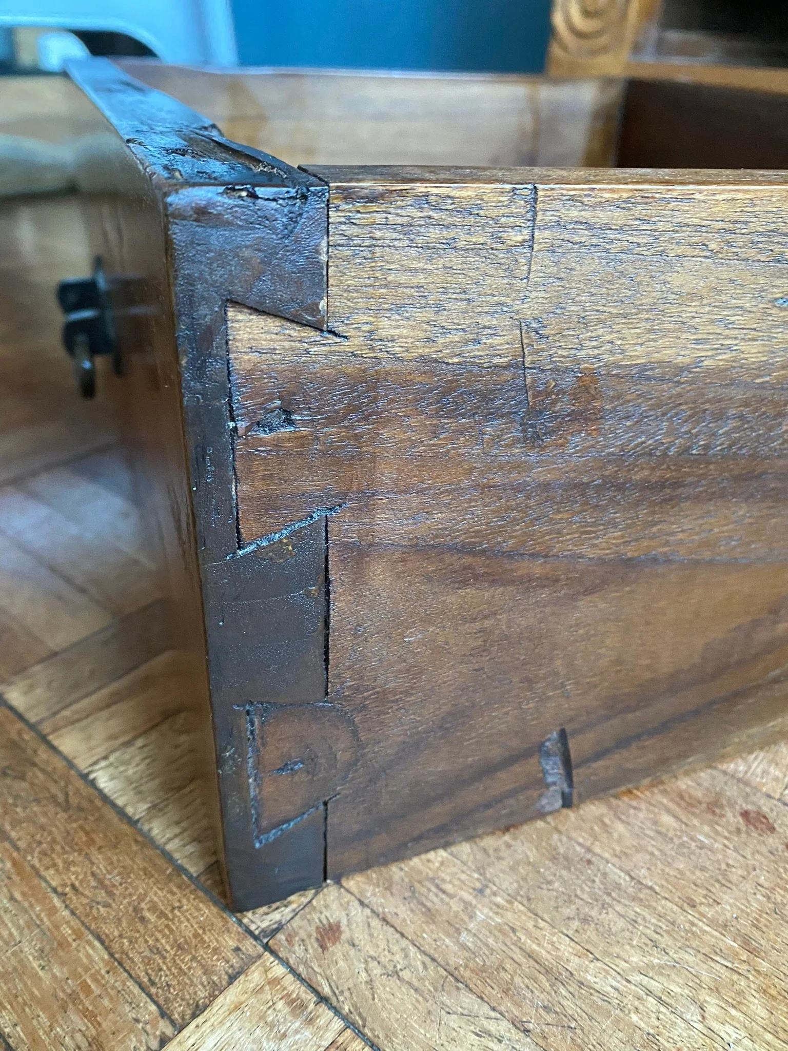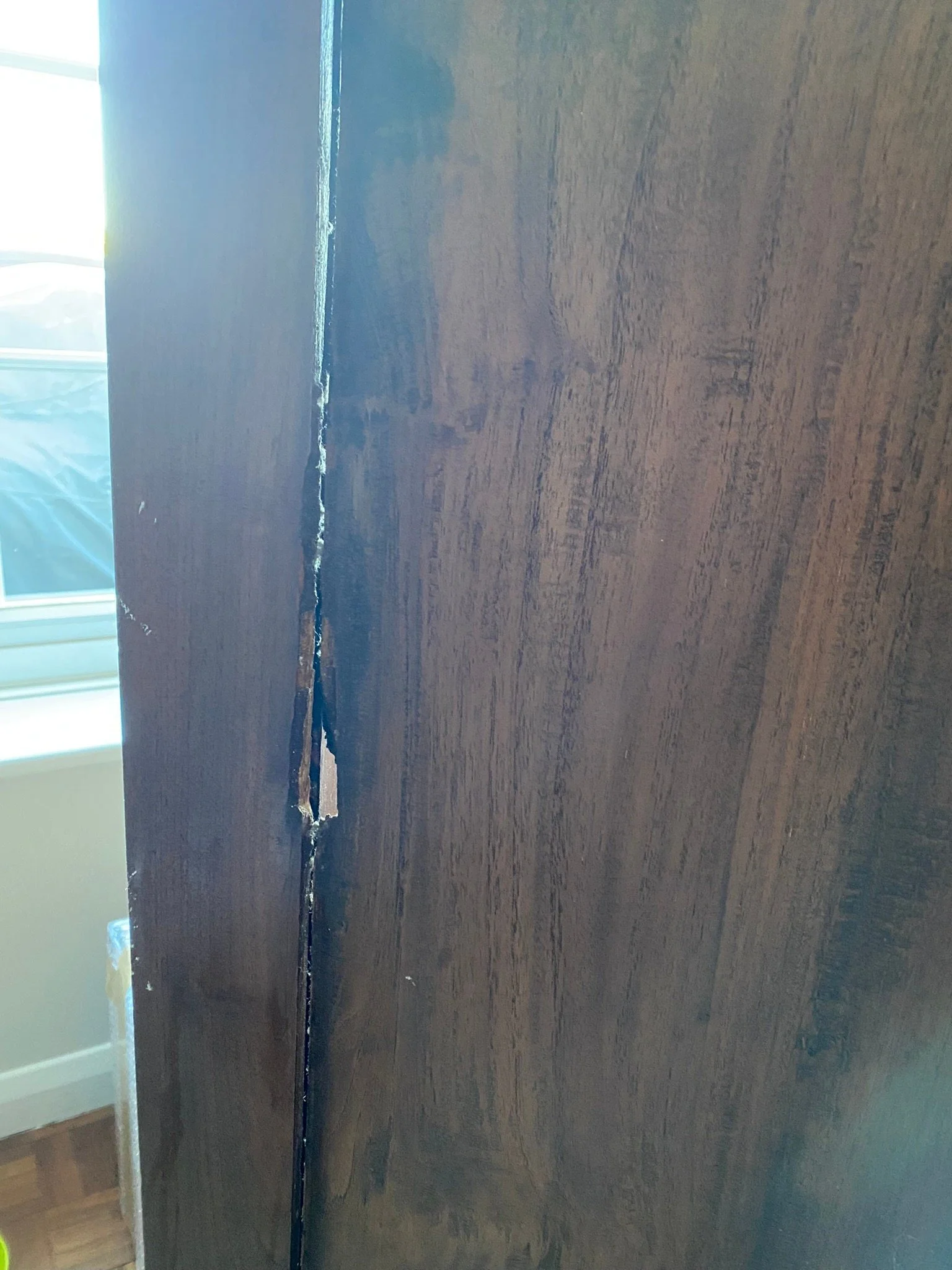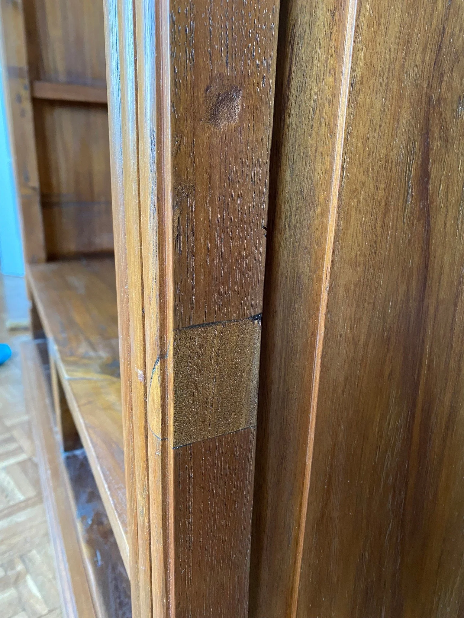 This is a high quality solid piece. There are a few knocks from use and age but these aren’t noticeable with its rustic design. I have rubbed down some the marks and scuffs and re oiled the whole piece. The back and side panels are a little warped but again this adds to its rustic appeal. There is a historical repair on the each side.