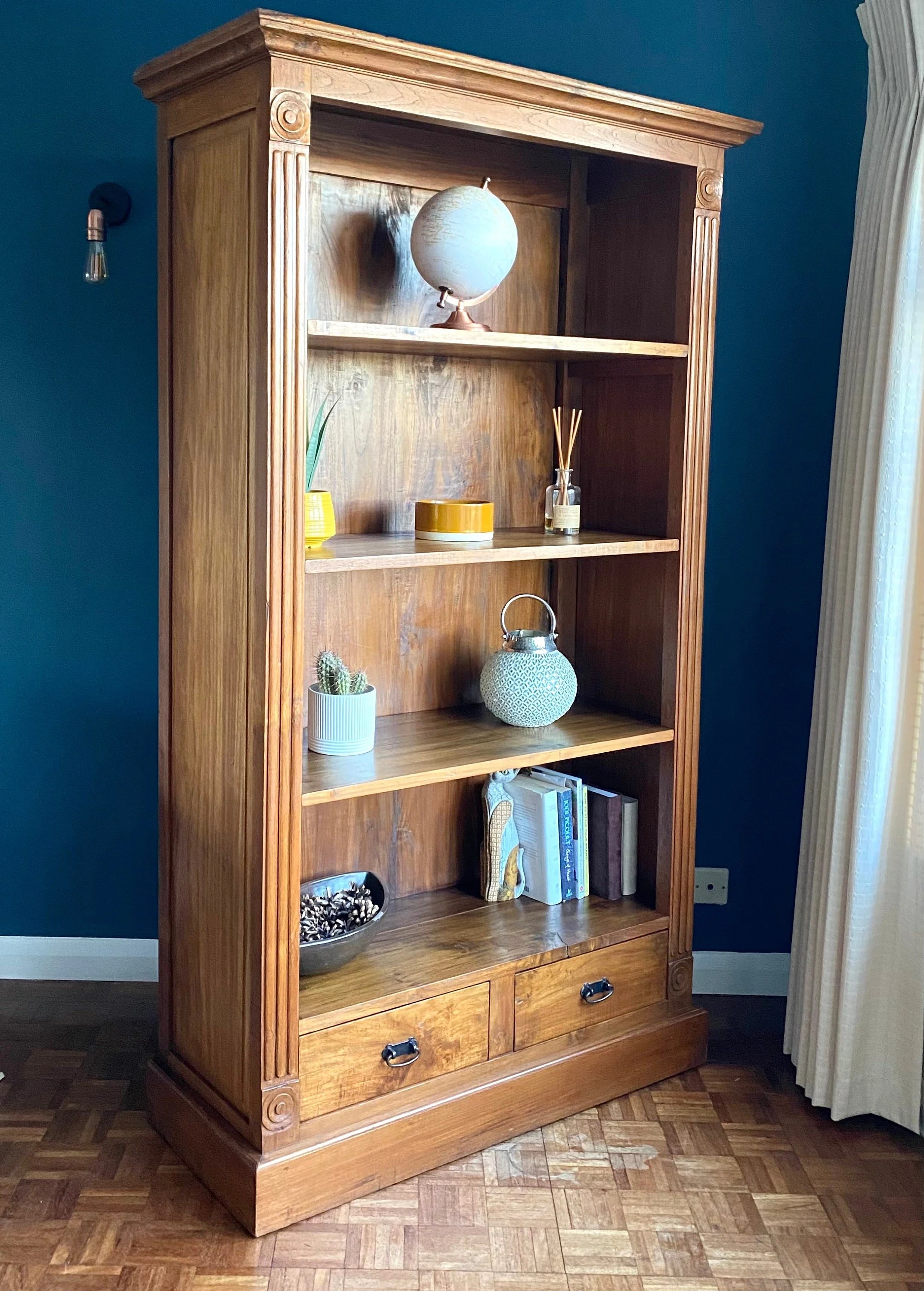 Beautiful high quality hand made Japanese bookcase Solid hard wood, possibly teak or rosewood Four shelves and two drawers Hand carved Wrought iron drawer handles