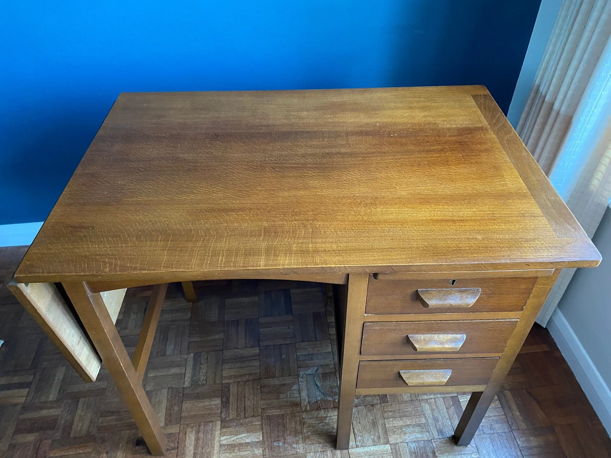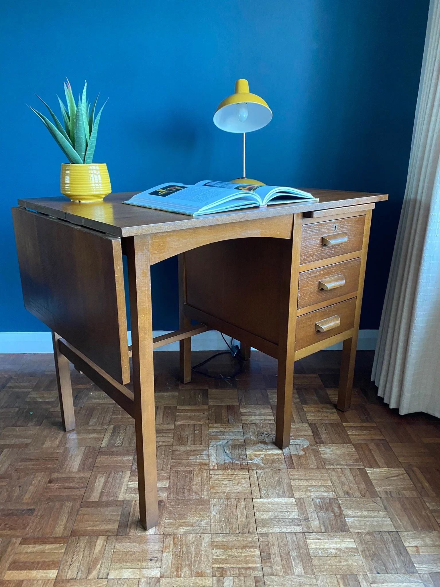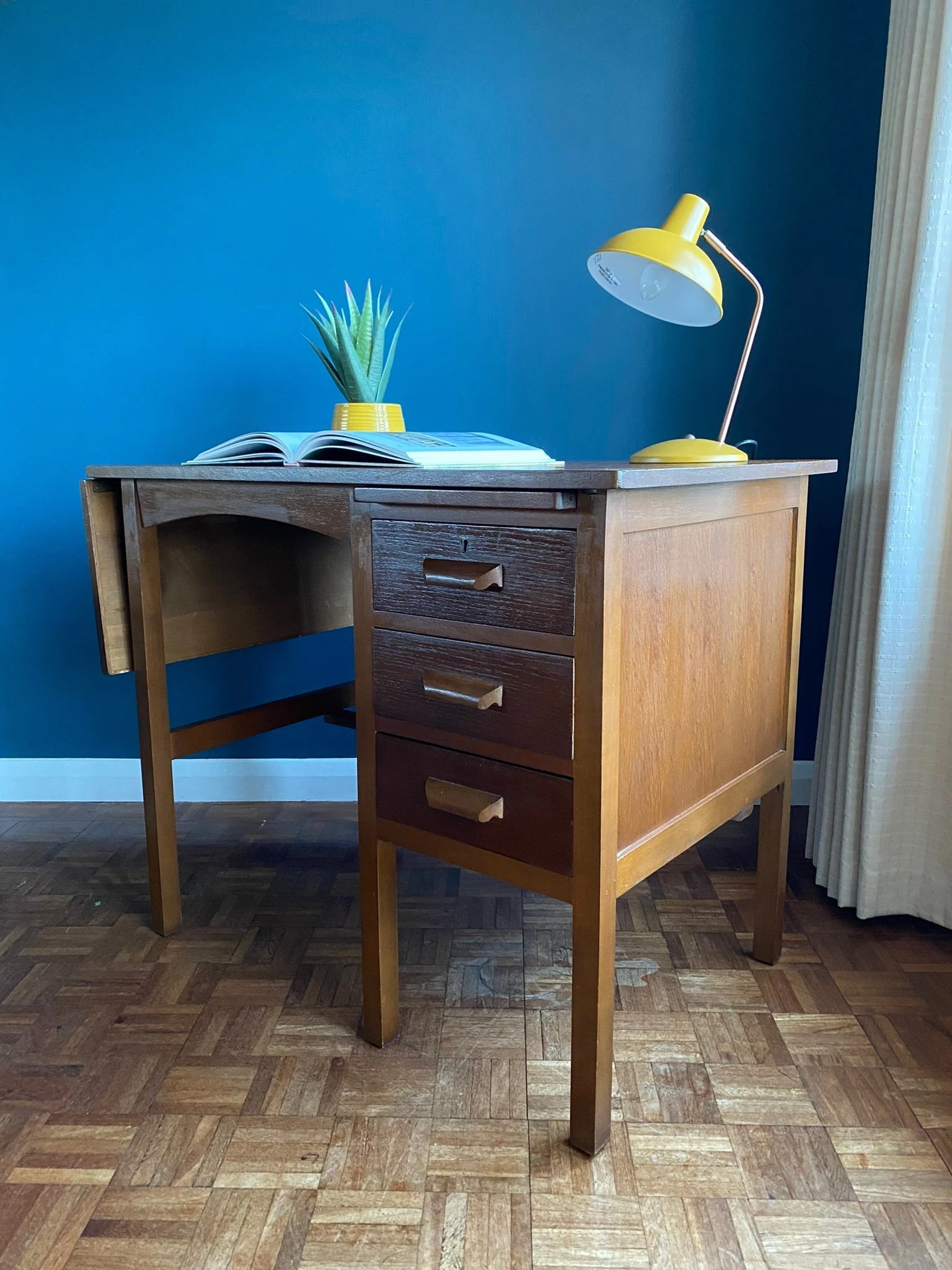 Vintage Mid Century 1950s dark oak veneer drop leaf teachers desk