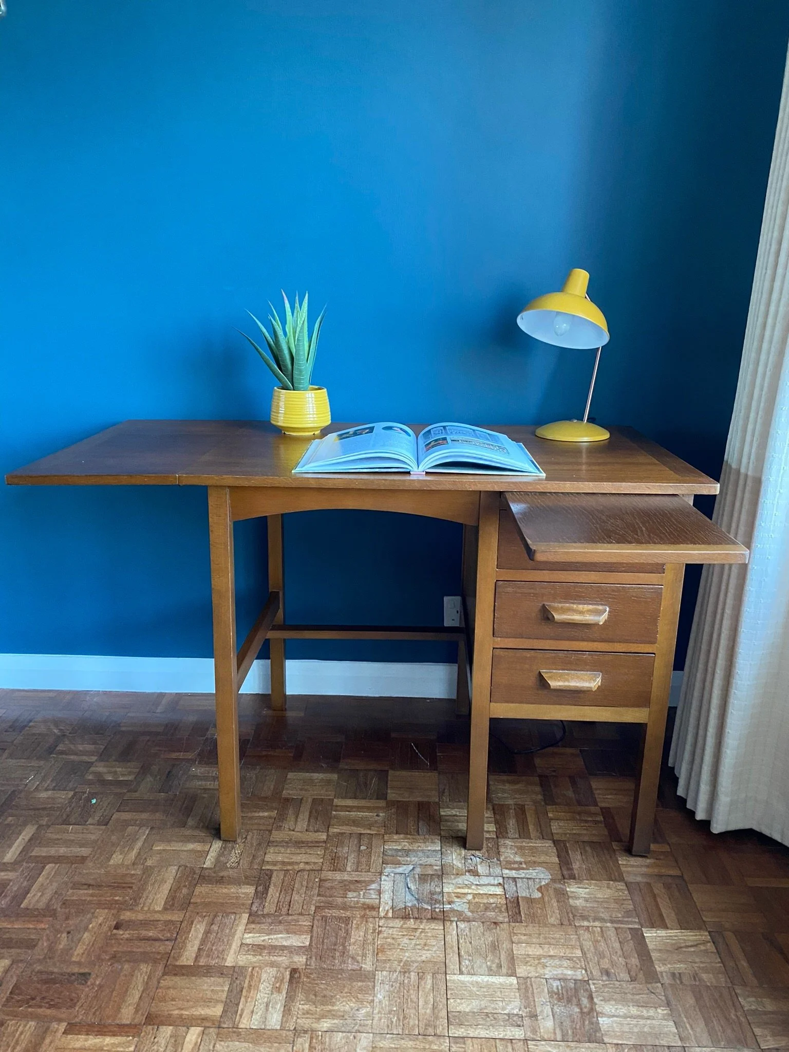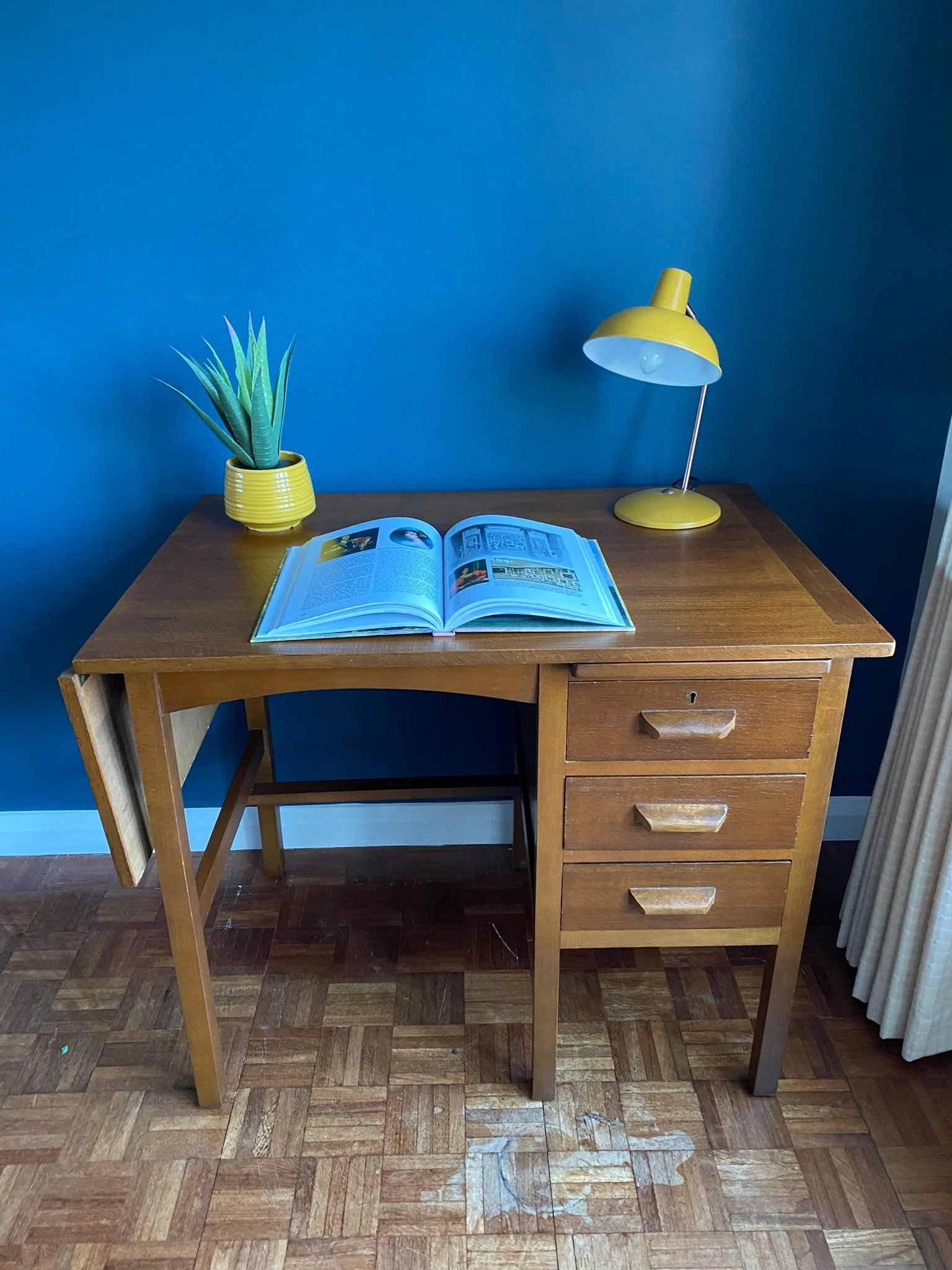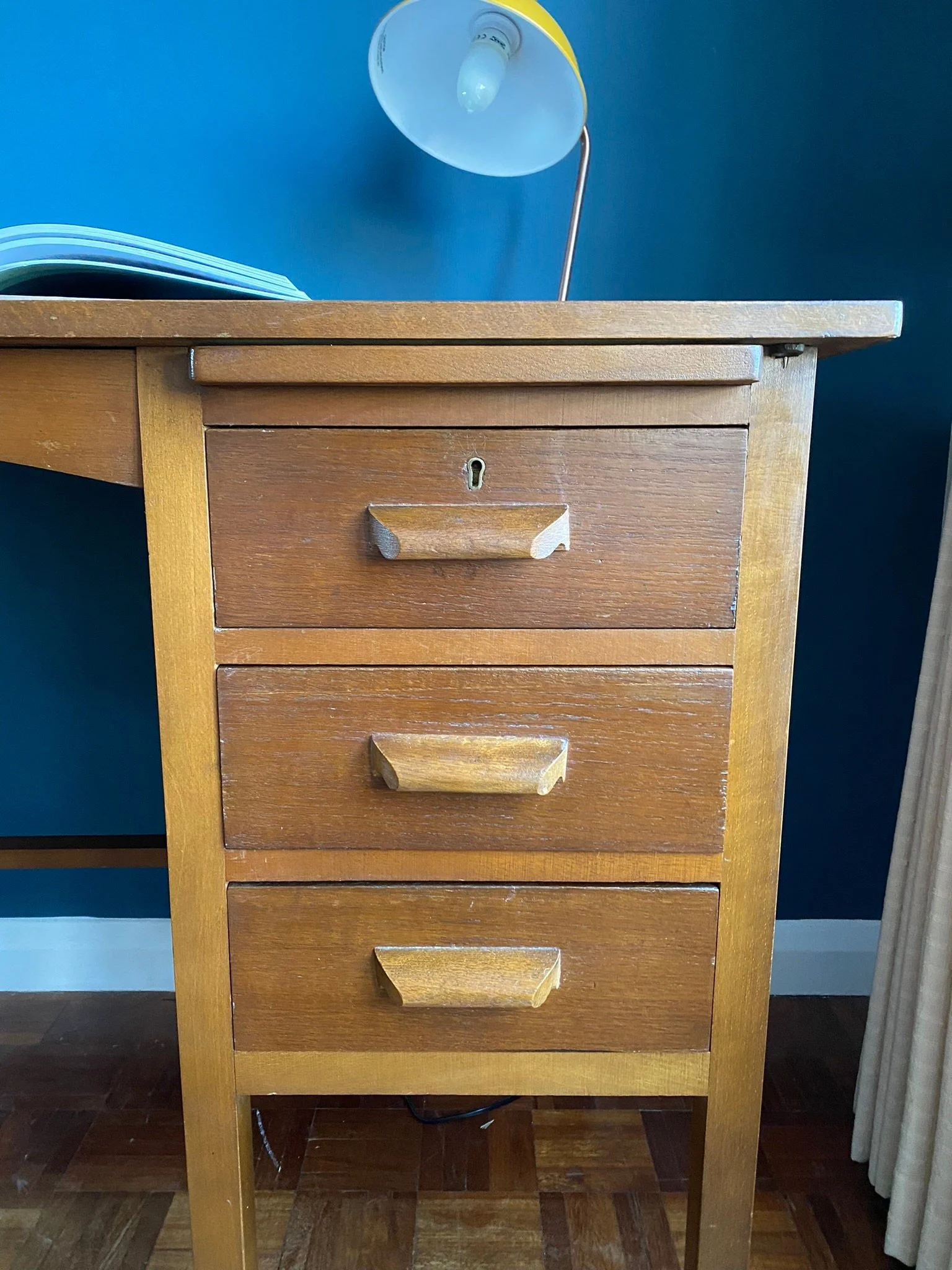 Vintage Mid Century 1950s dark oak veneer drop leaf teachers desk