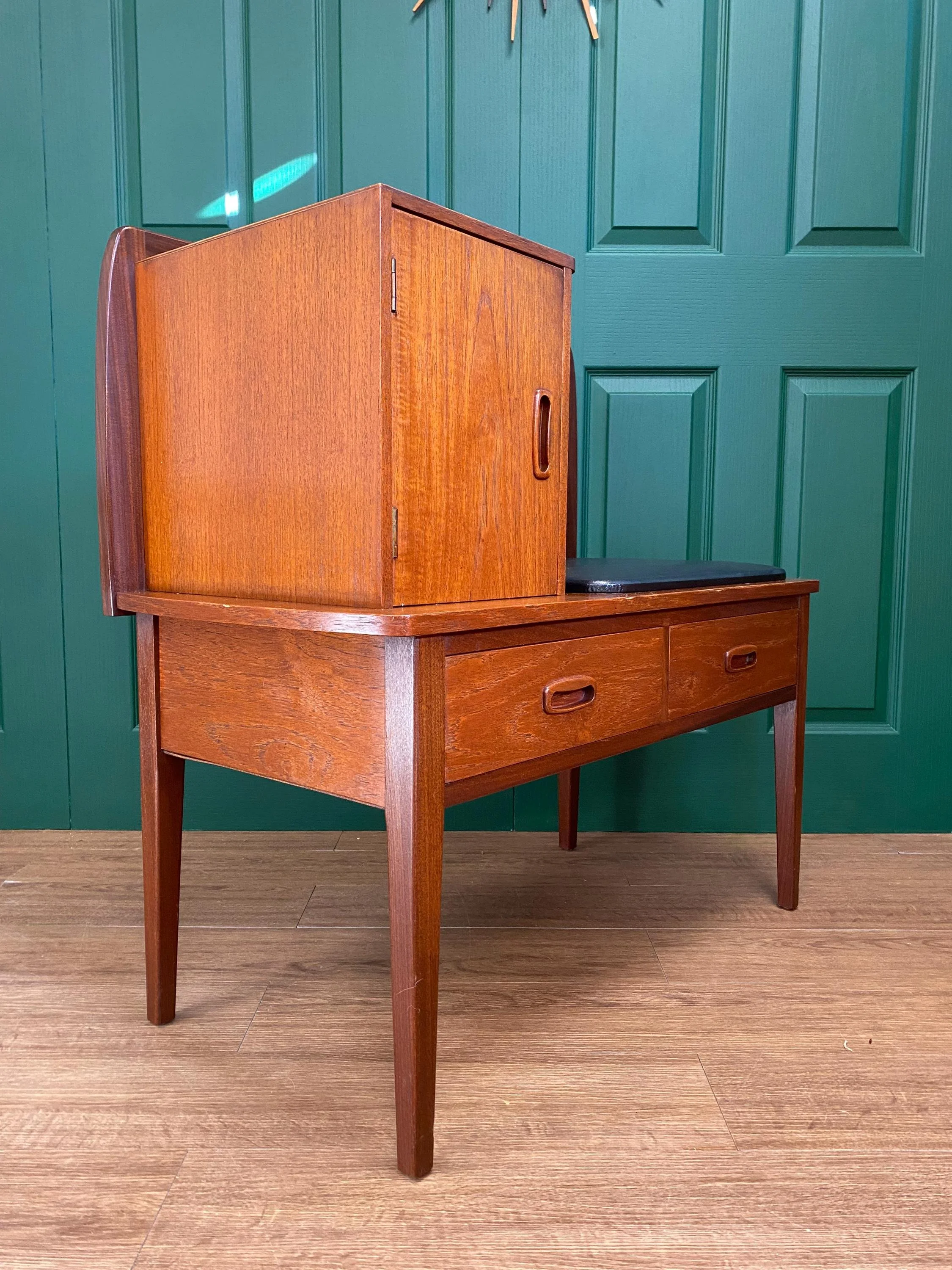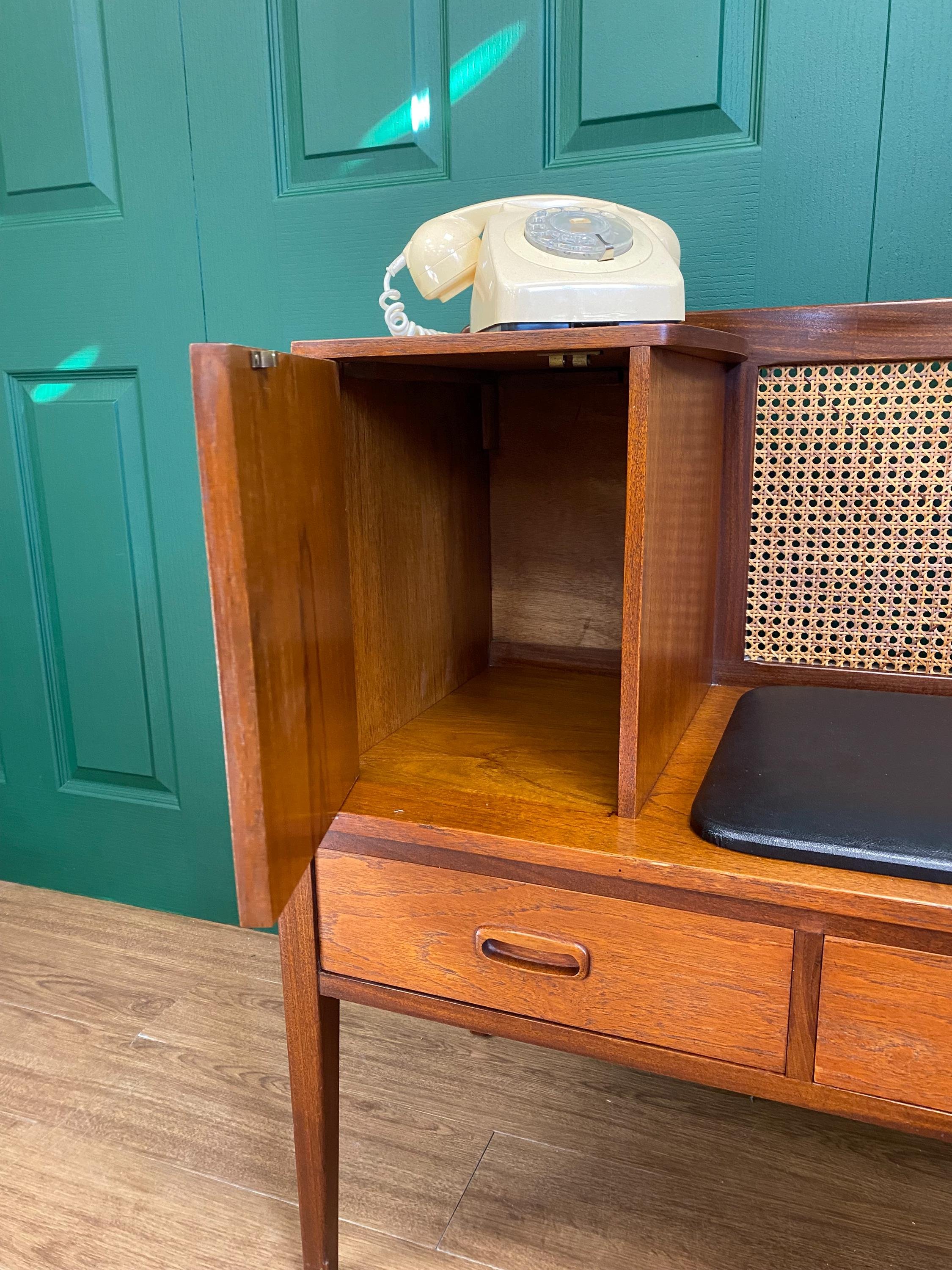 Mid century teak telephone table Two drawers and a single cupboard with rattan back and original black faux leather seat Teak veneer with solid teak handles Tapered legs 1960s