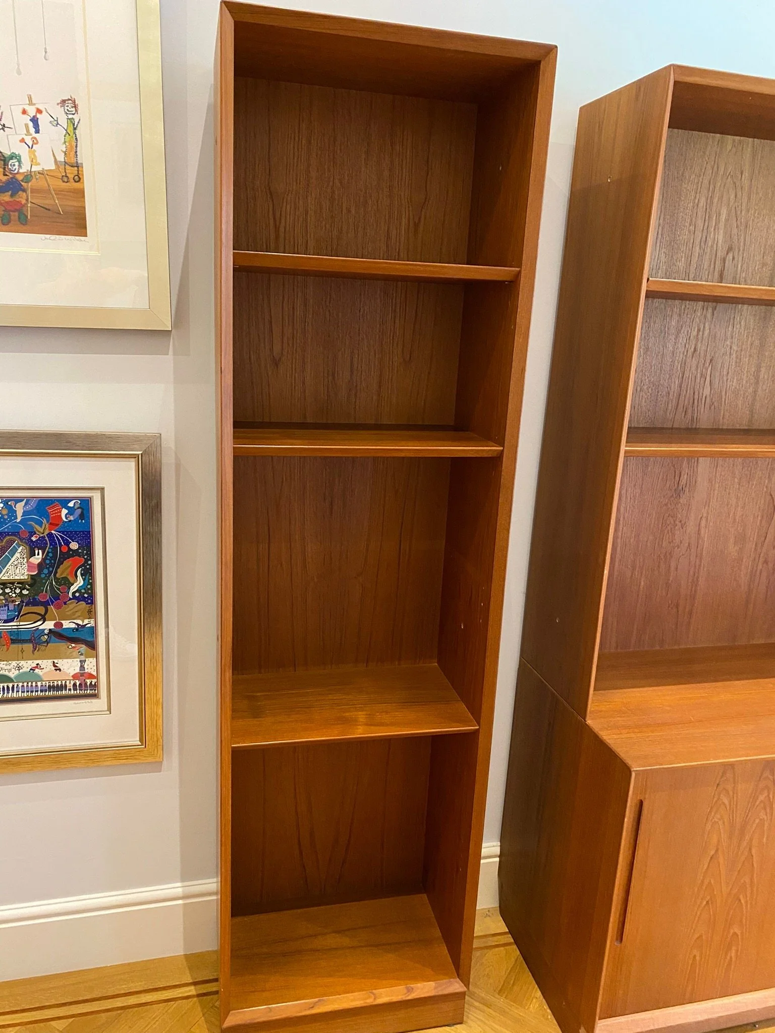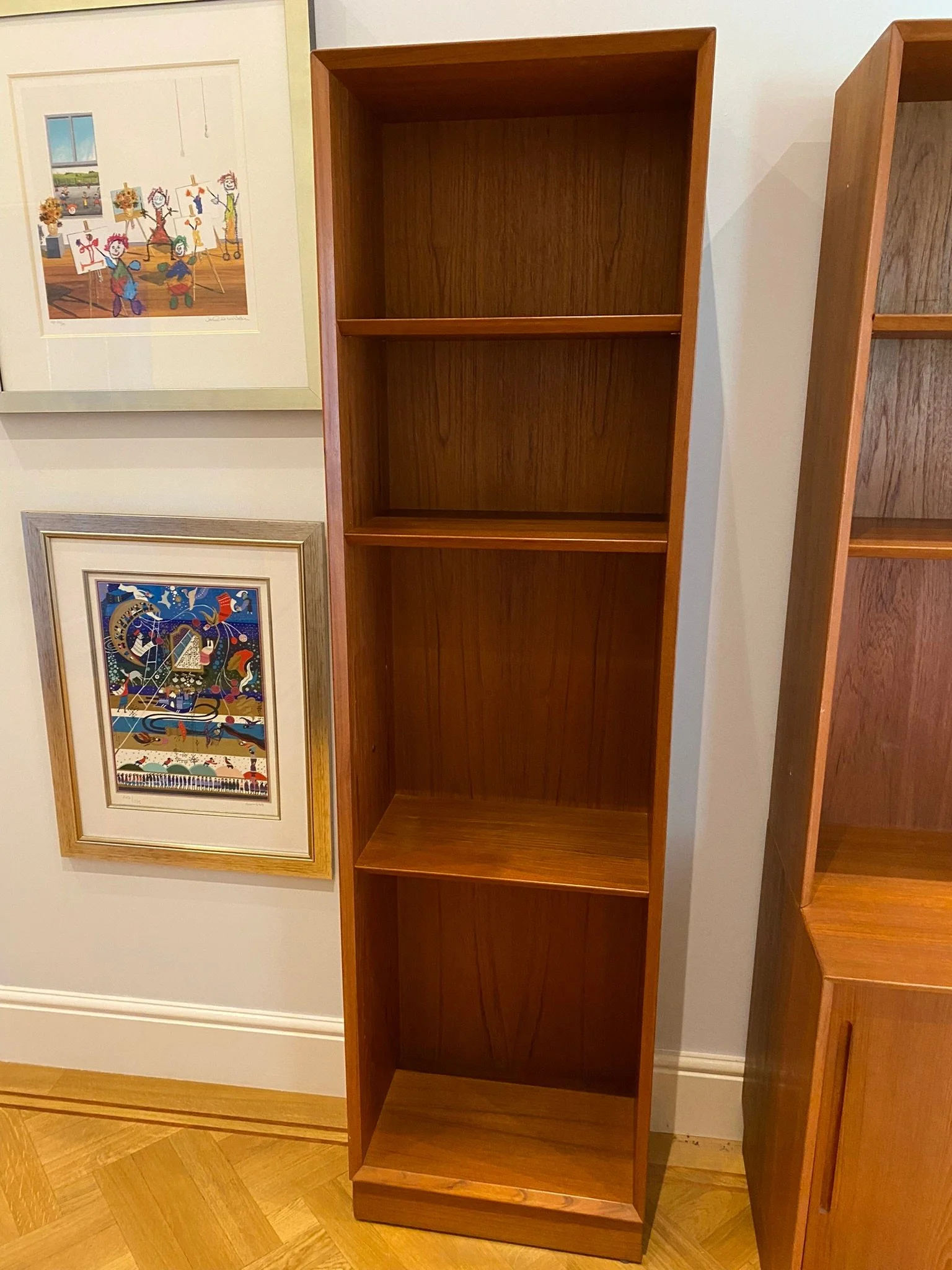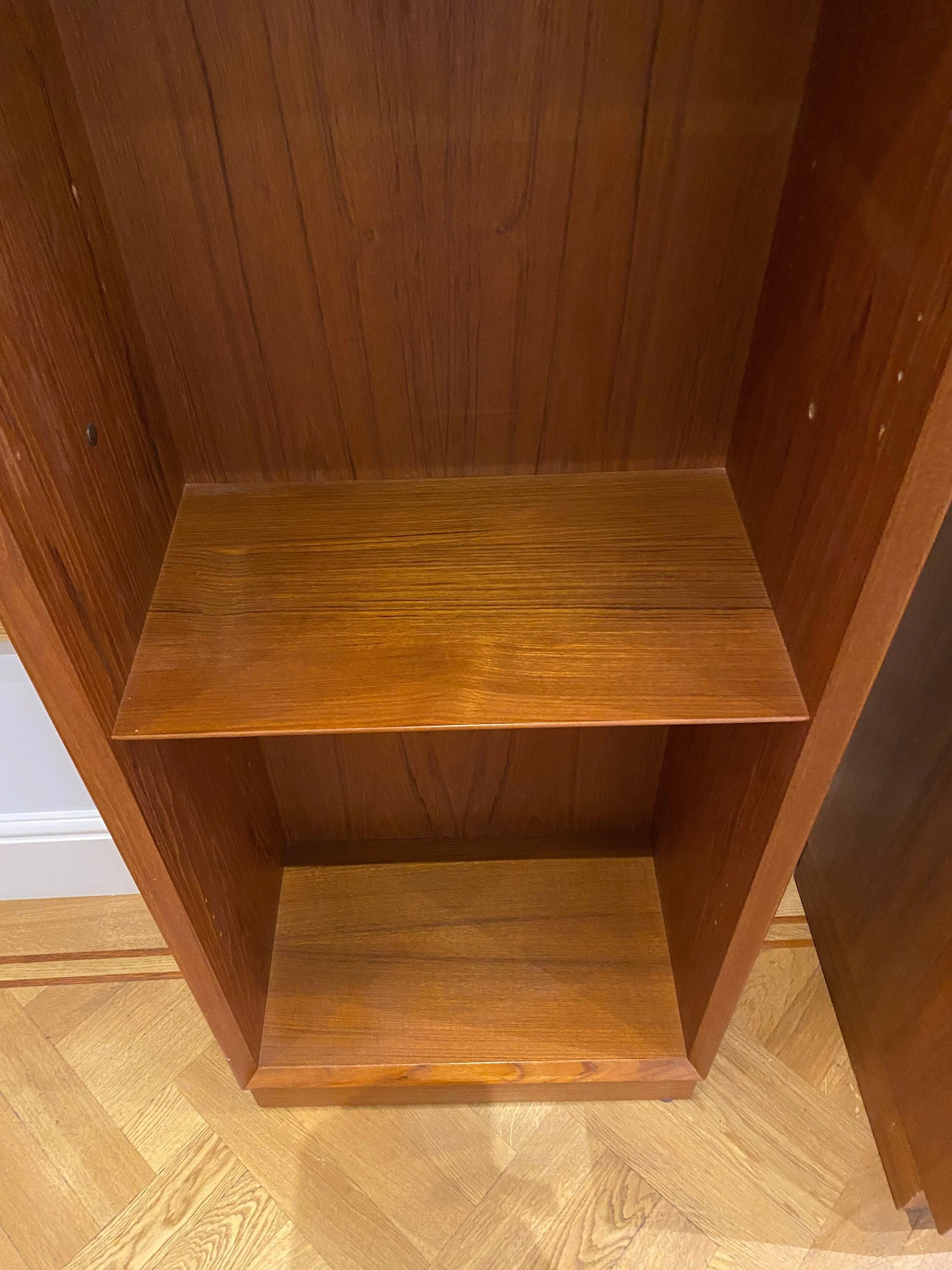 Sleek and stylish mid century teak tall bookcase One fixed shelf two adjustable shelves Marked ‘Made in Denmark’ Purchased in the mid 1970s Classic Scandinavian design with a bevelled edge