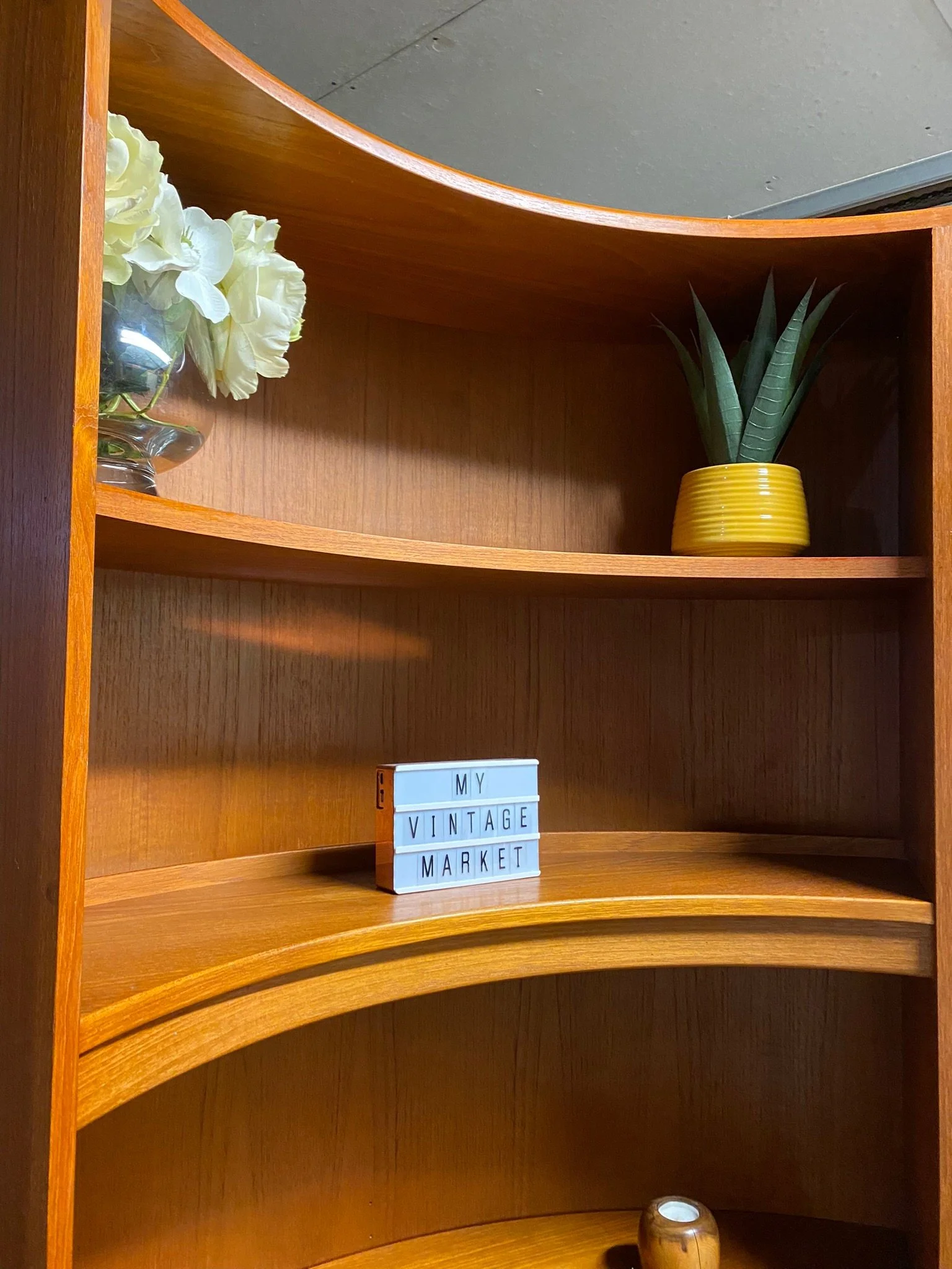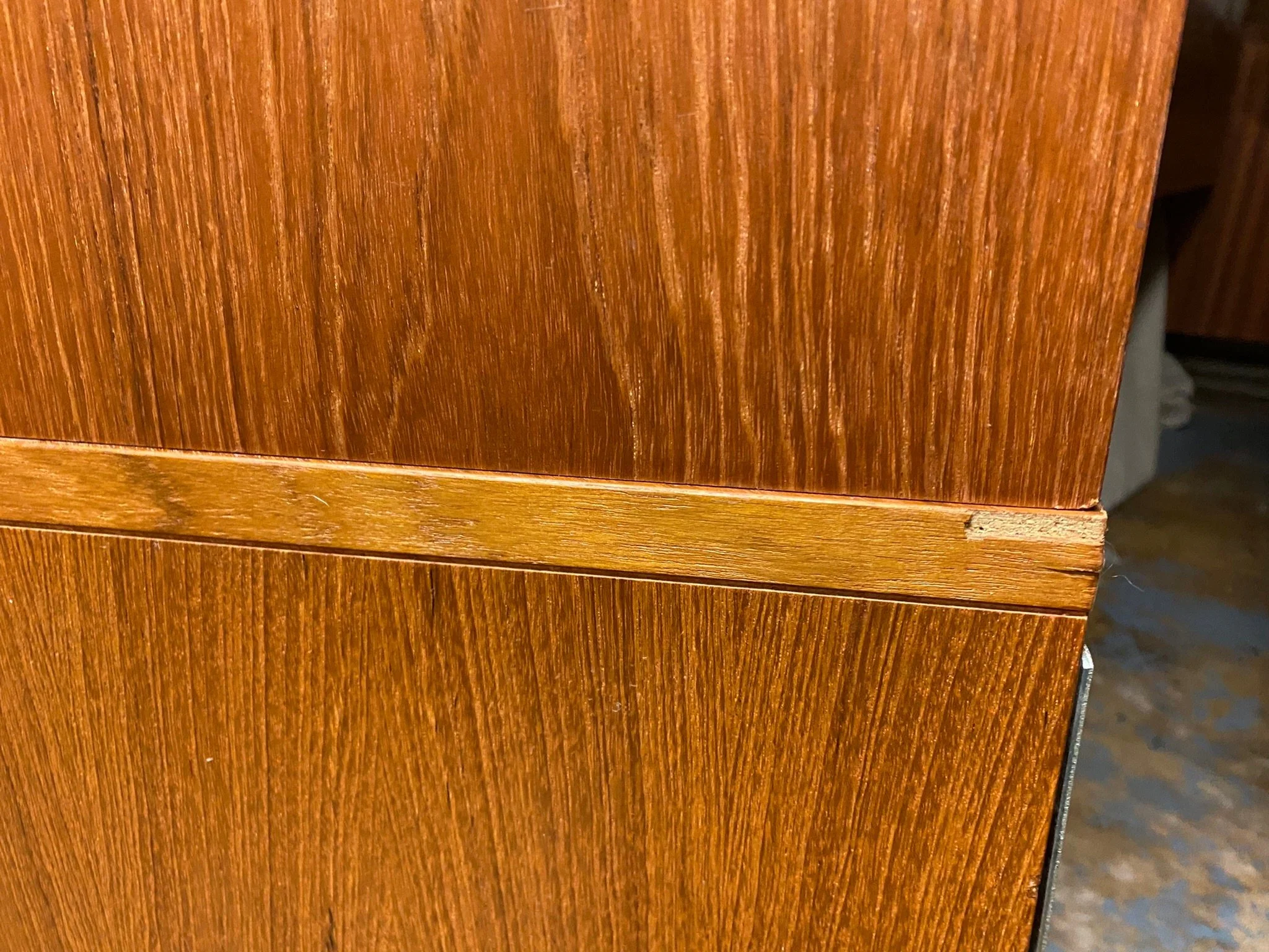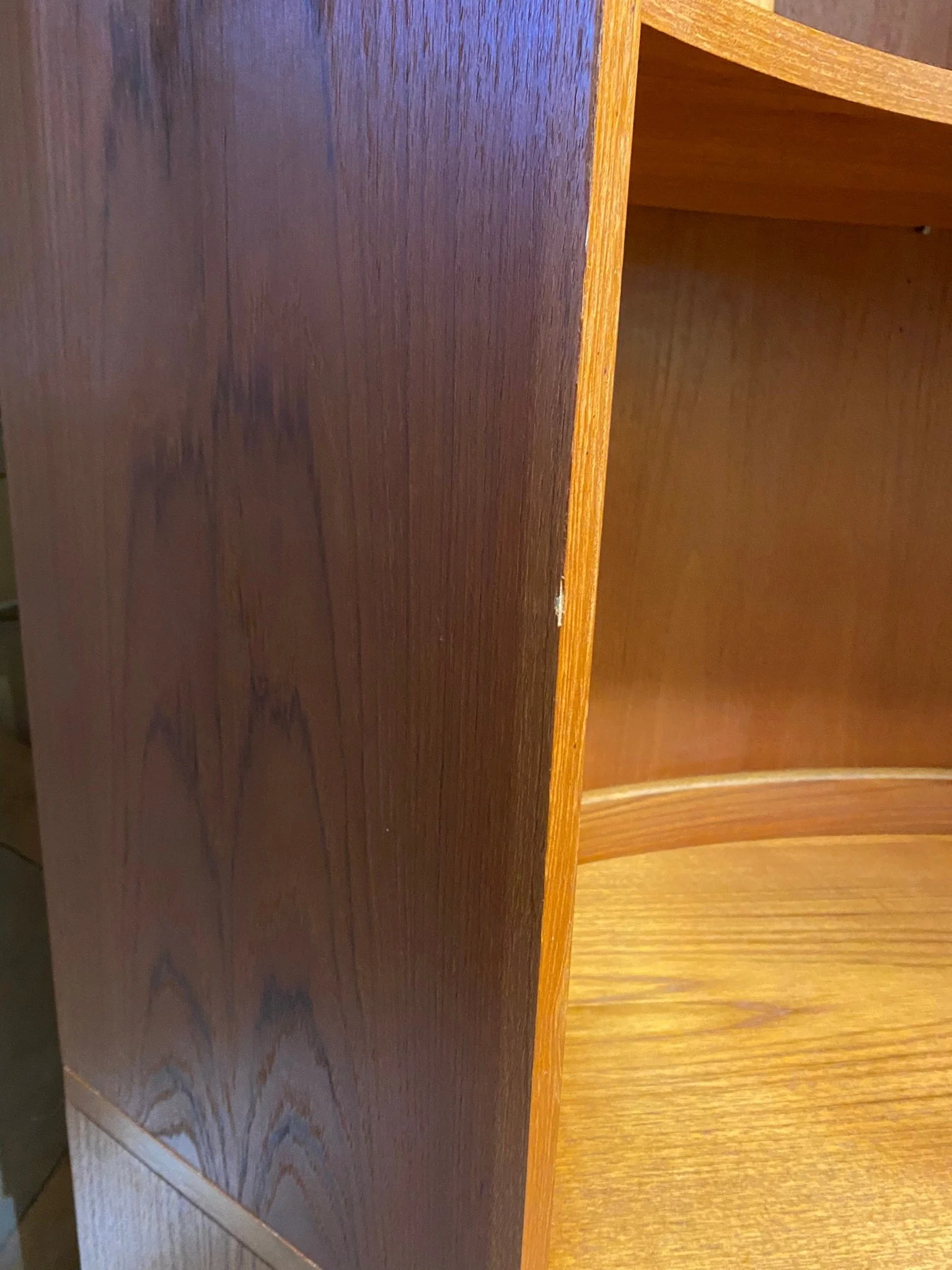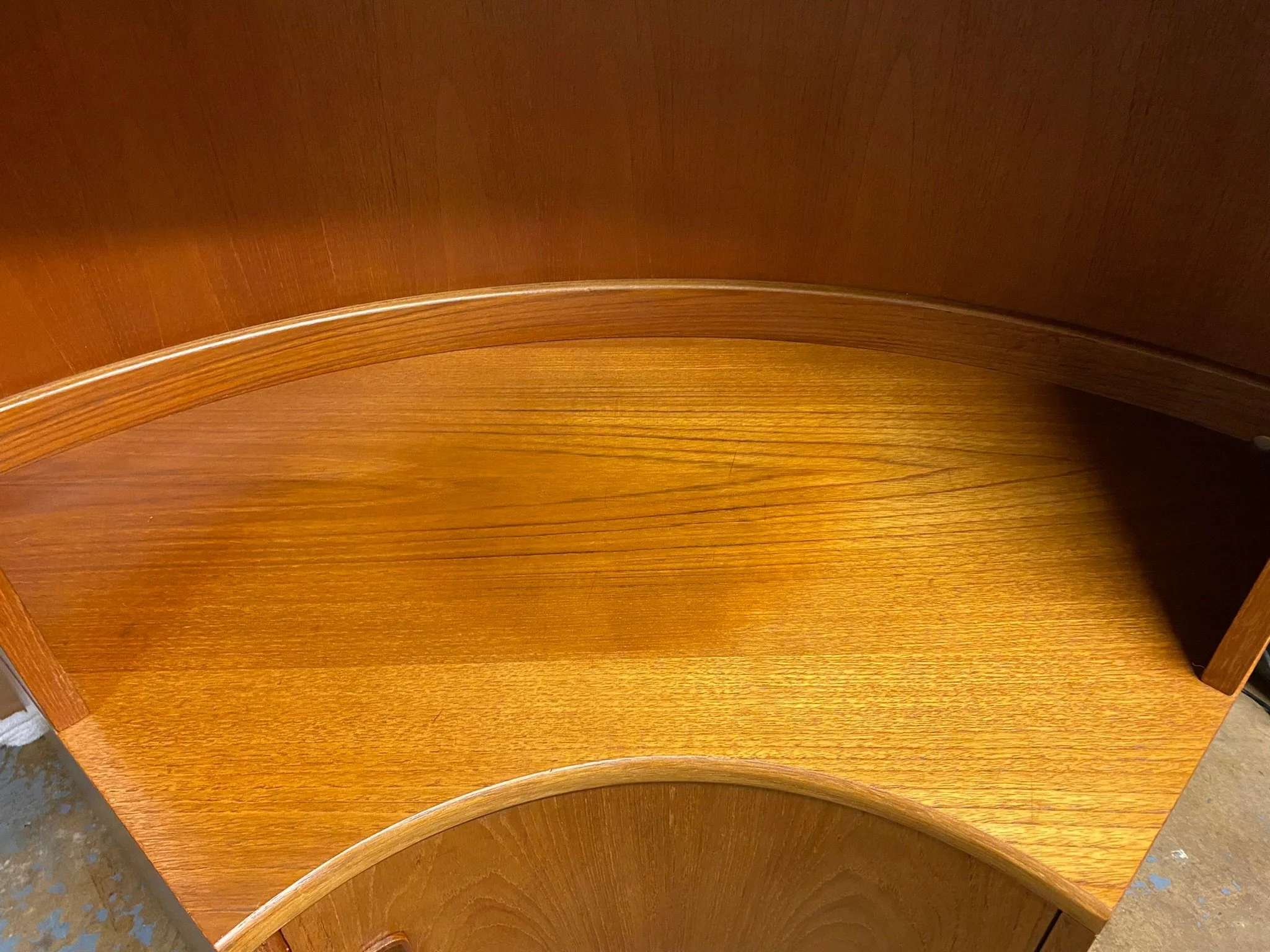 A high quality beautiful mid century piece in great condition. It has been restored by rubbing down, oiling and polishing. There are some small scuffs and marks throughout and tiny chips on the veneer as expected for its age, see photos. There is a bit of sun fading on the top of the base unit and the door and a small veneer chip on the right side of the base, see photos. Otherwise in very good condition.