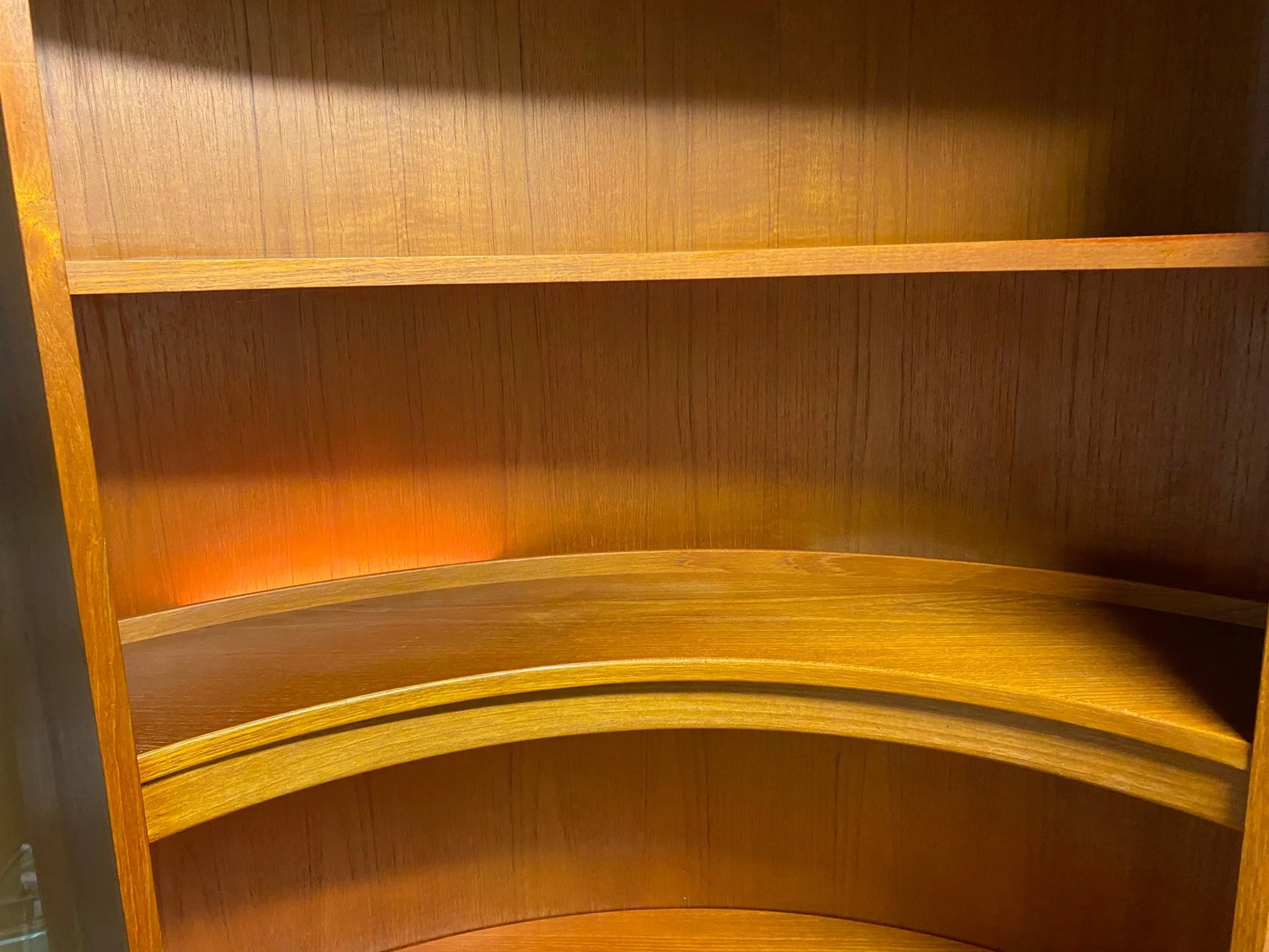 Comes in two sections. Lower single door cupboard and top section with one fixed central shelf with a light behind and two adjustable shelves Solid teak handles