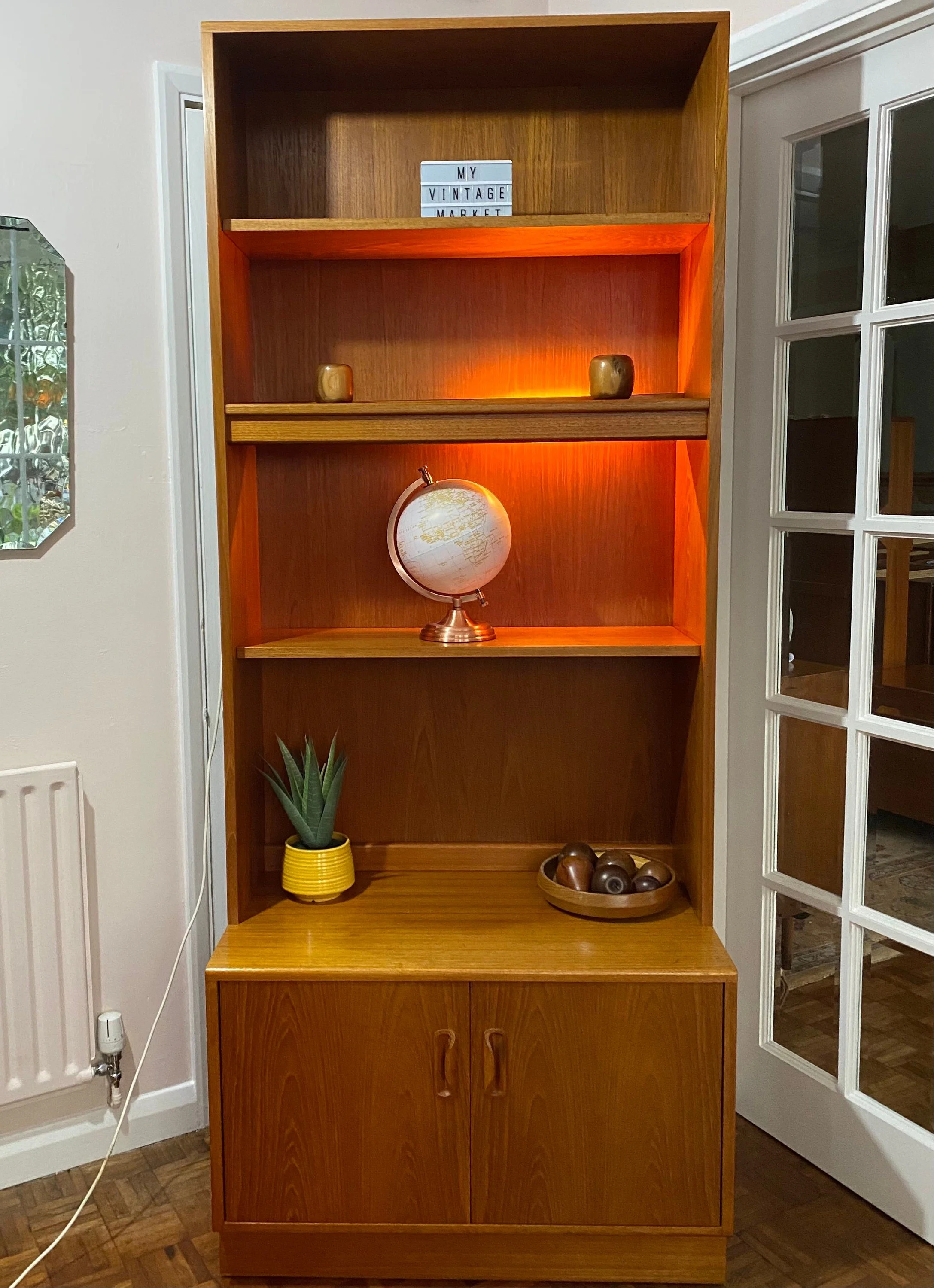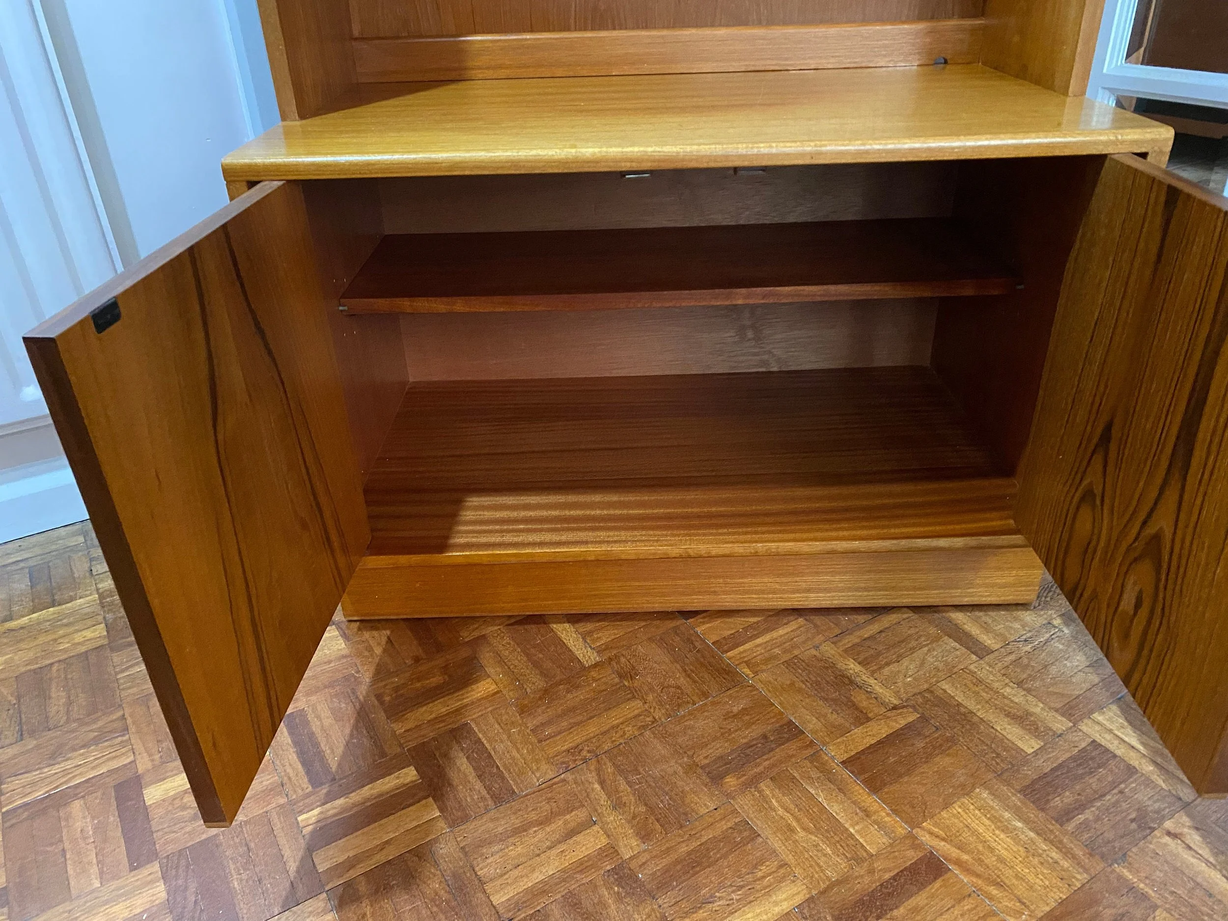 Comes in two sections. Lower section has double doors and a single adjustable shelf. Top section has one fixed central shelf with a light behind and two adjustable shelves Solid teak handles