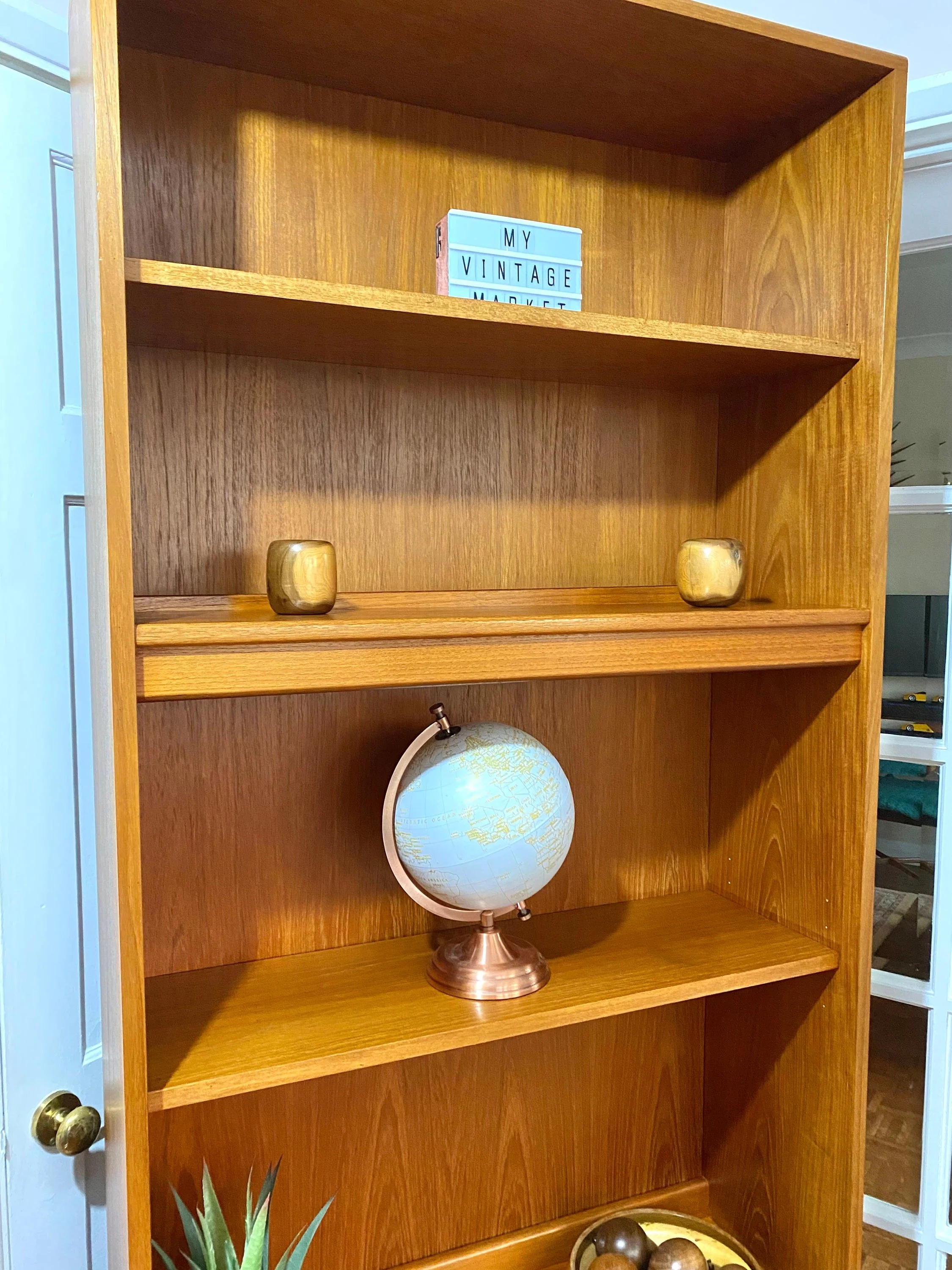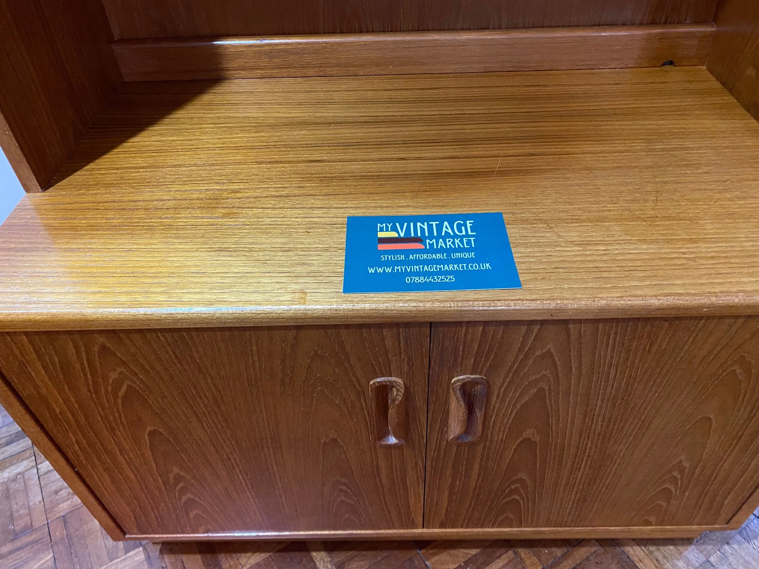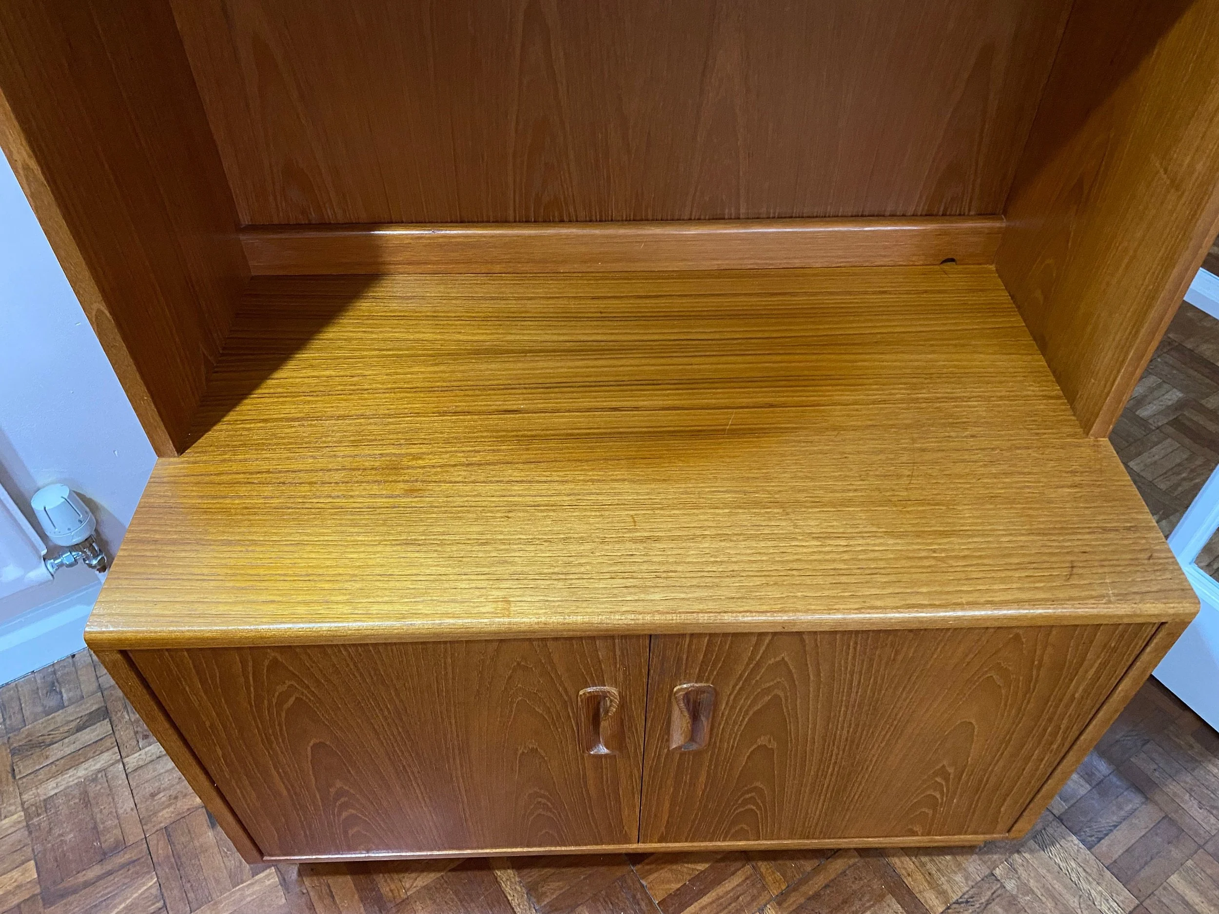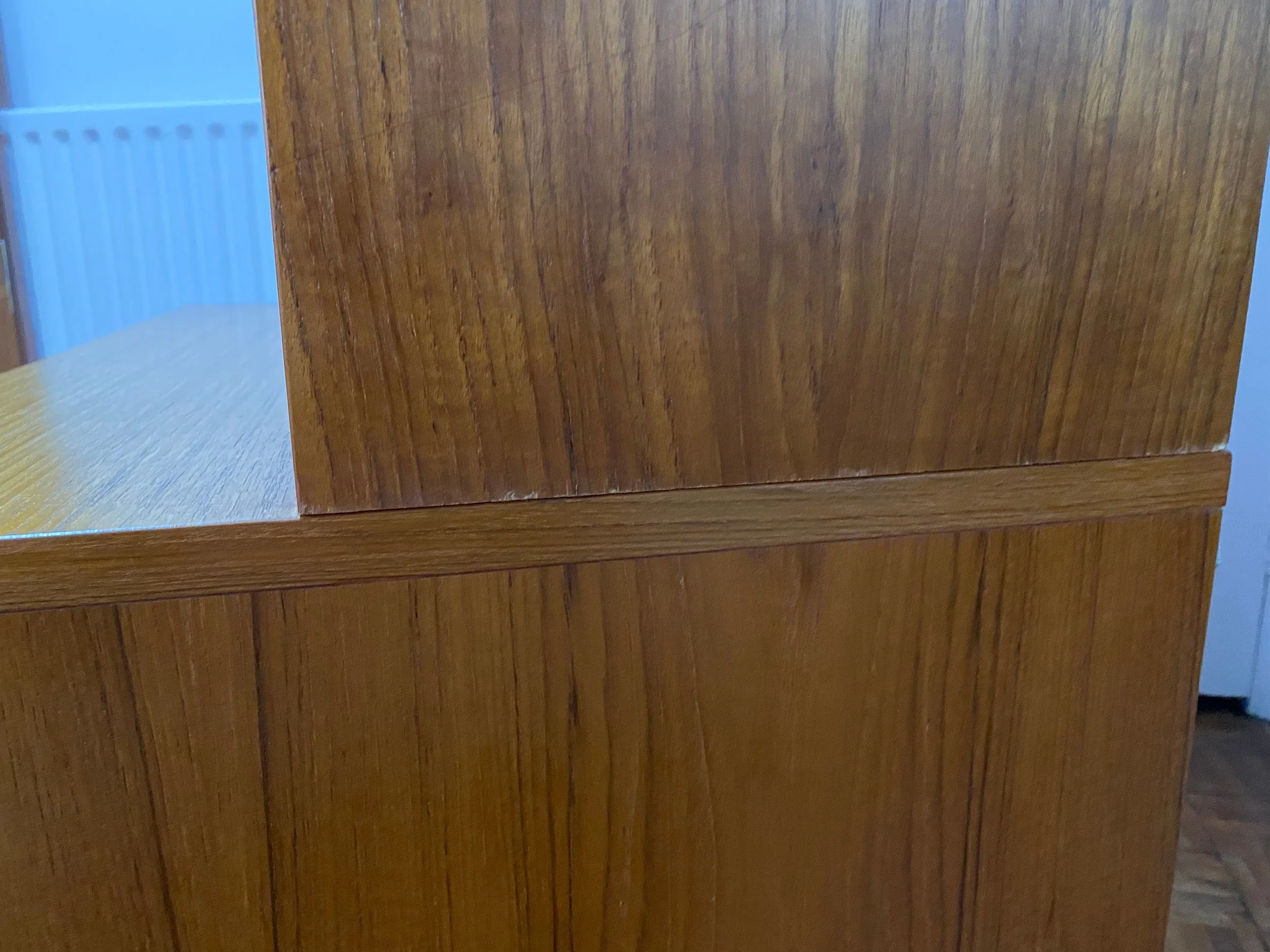 A high quality beautiful mid century piece in great condition. It has been restored by rubbing down, oiling and polishing. There are some small scuffs and marks throughout and tiny chips on the veneer at the base of the top section as expected for its age, see photos. There is a bit of sun fading on the top of the base unit, see photos. Otherwise in very good condition.