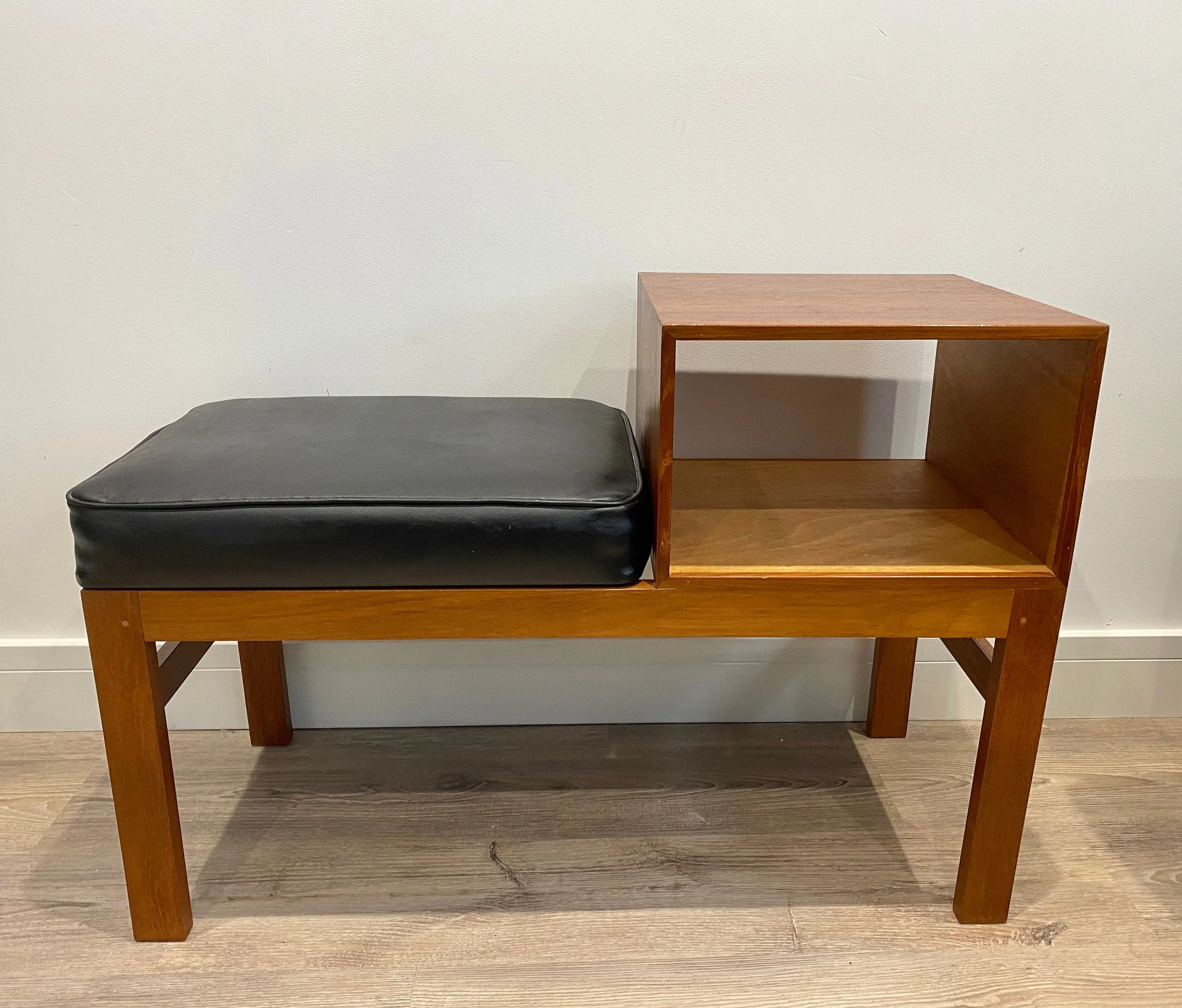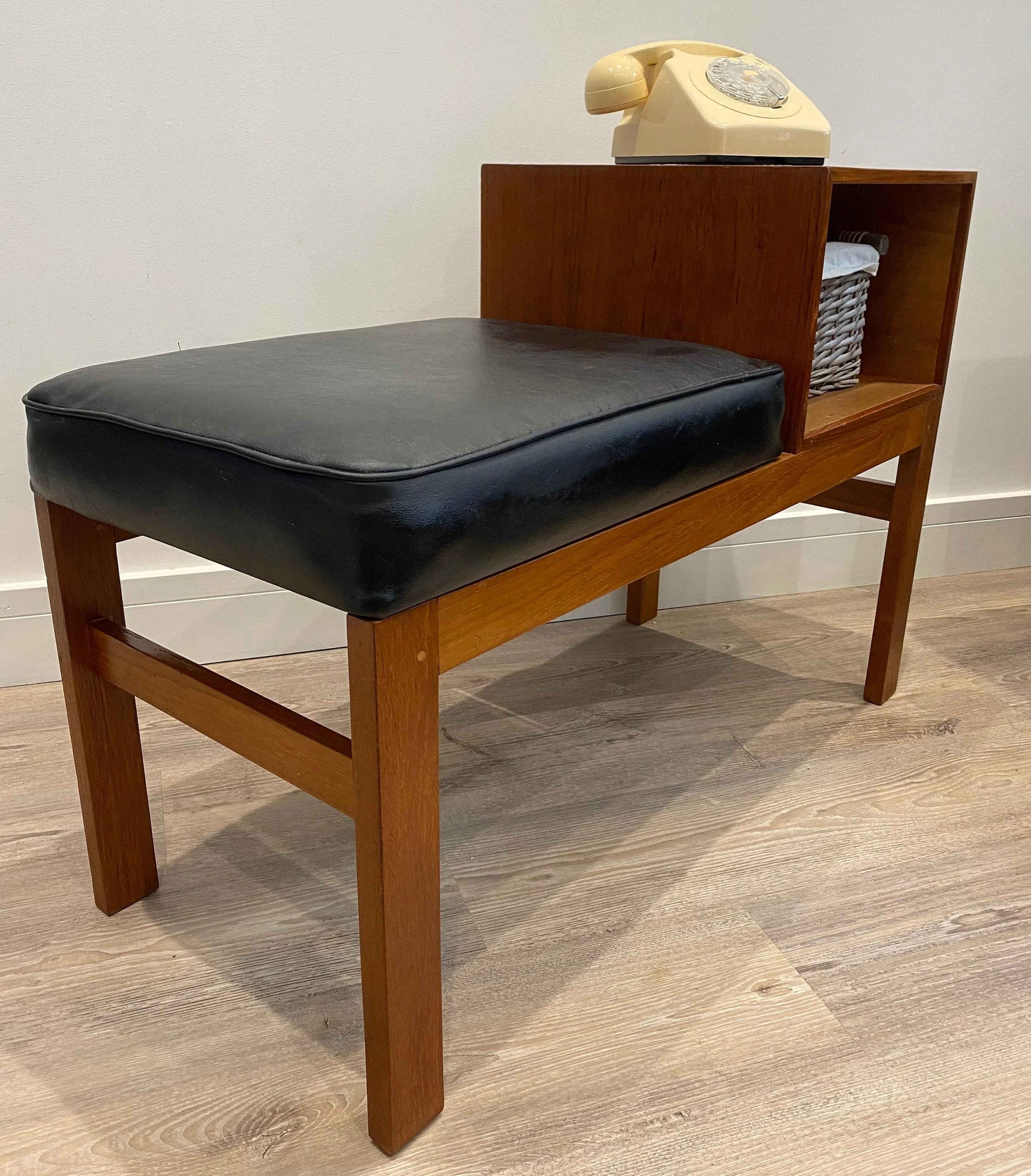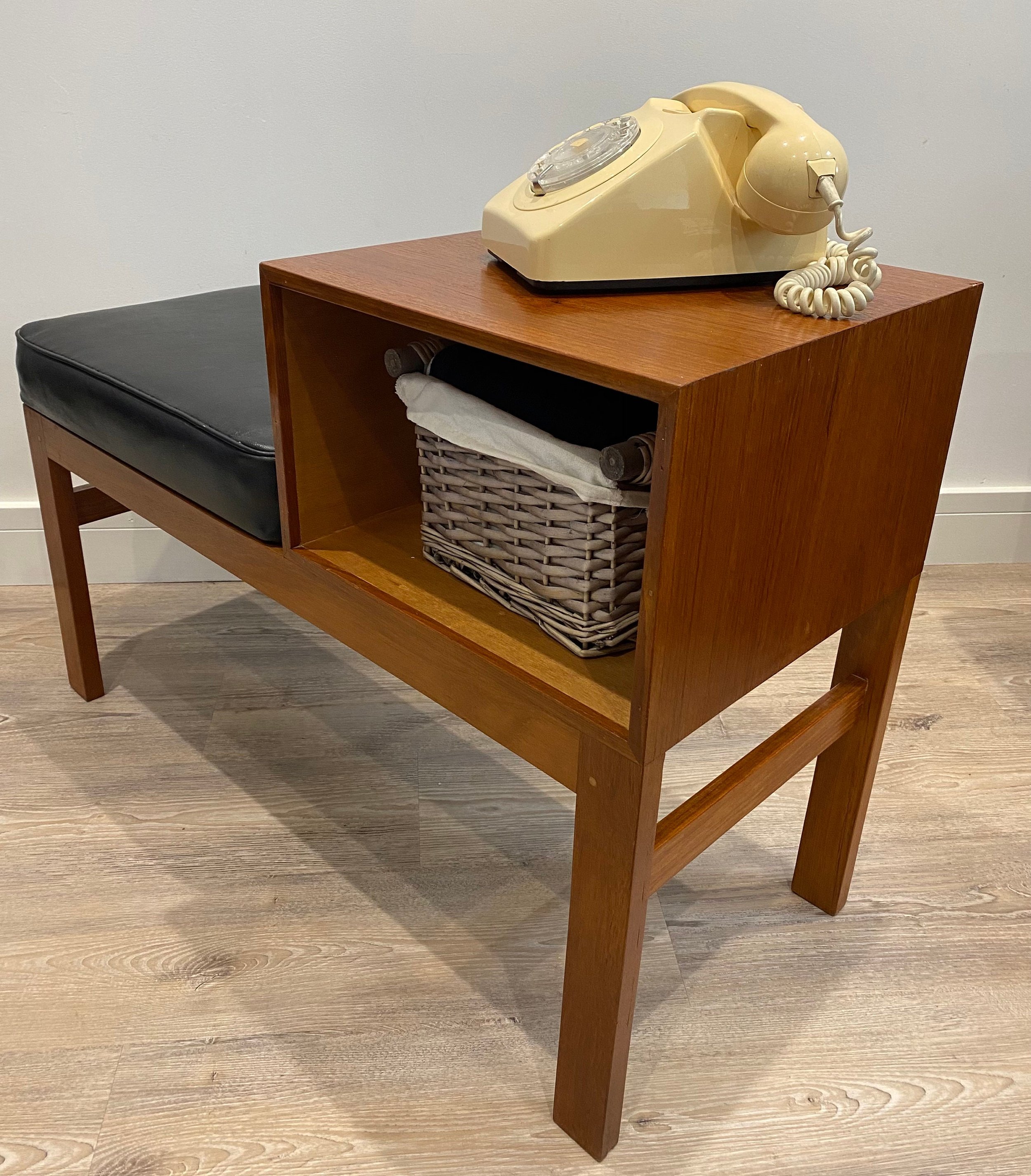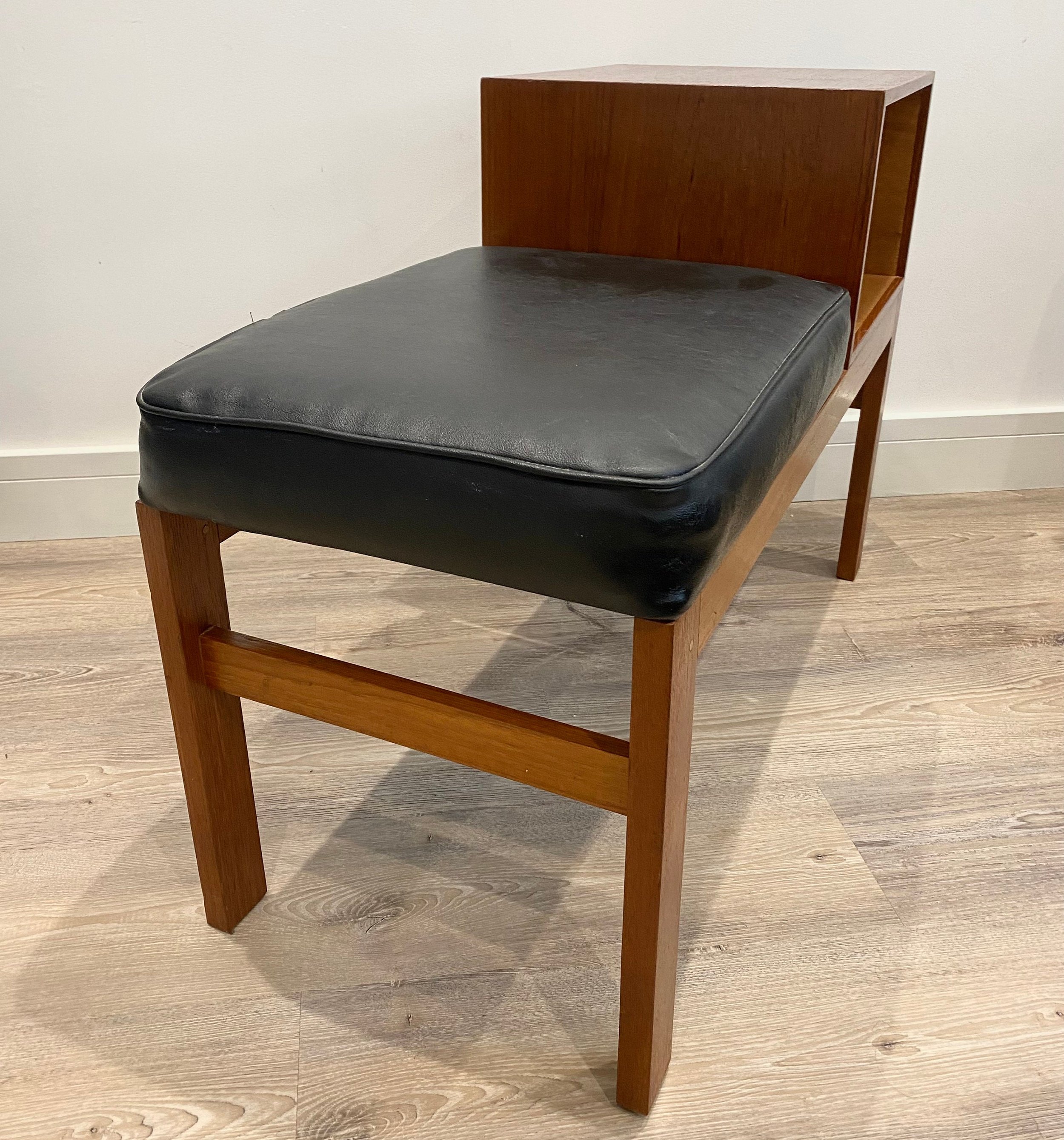 Mid century teak telephone table Circa 1960s Teak veneer open section with black leather seat 84cm wide x 36cm deep x 58cm high. Seat height 44cm.