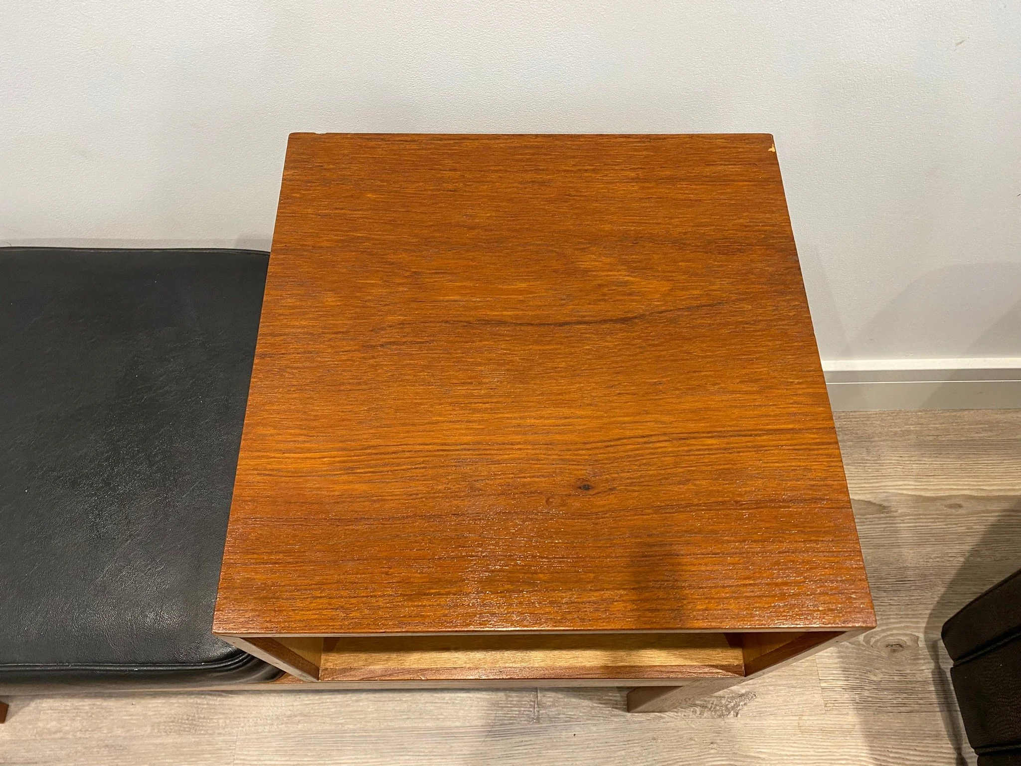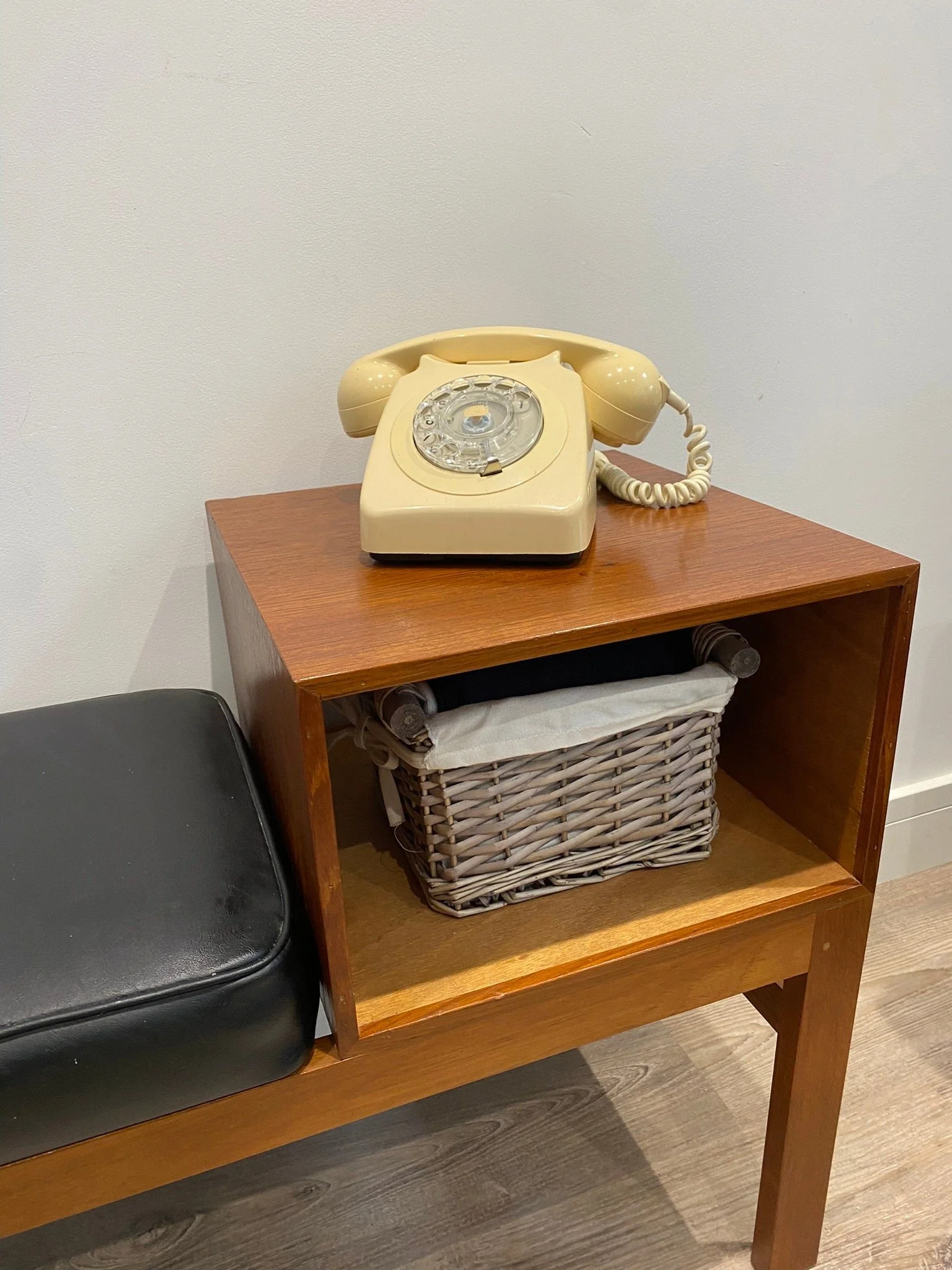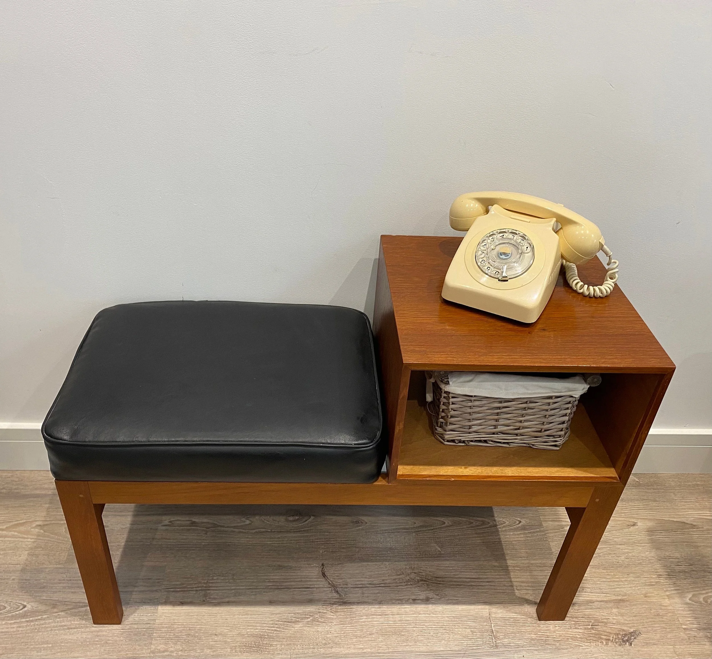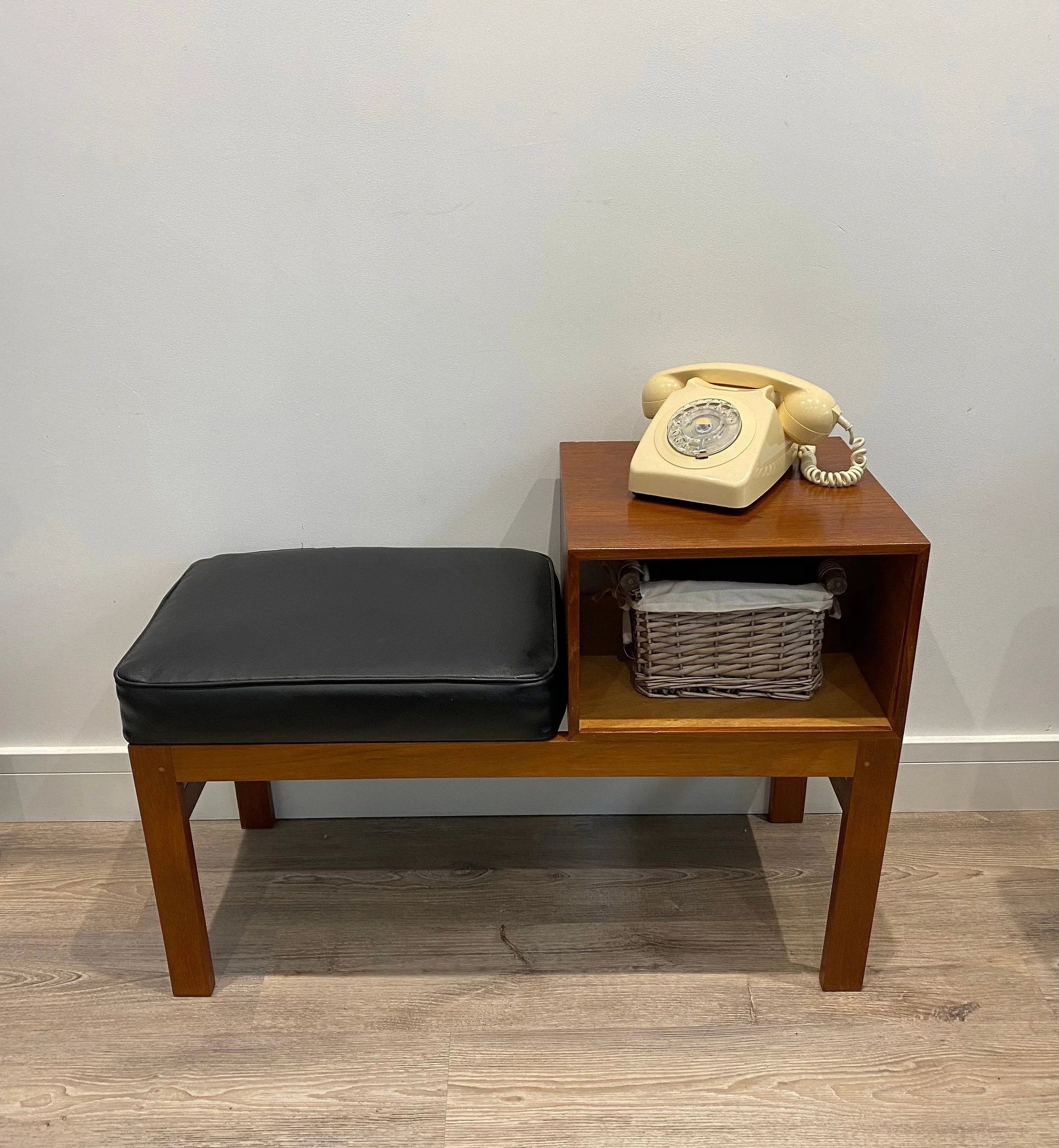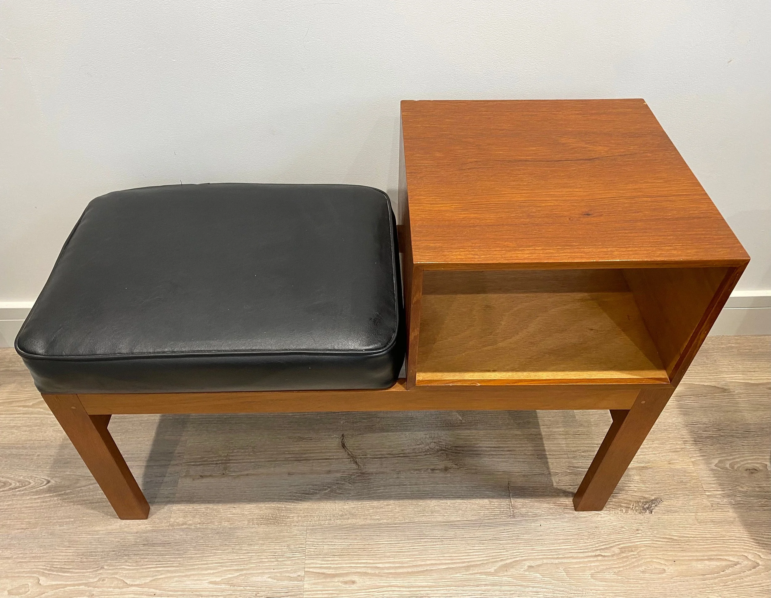 Mid century teak telephone table Circa 1960s Teak veneer open section with black leather seat 84cm wide x 36cm deep x 58cm high. Seat height 44cm.